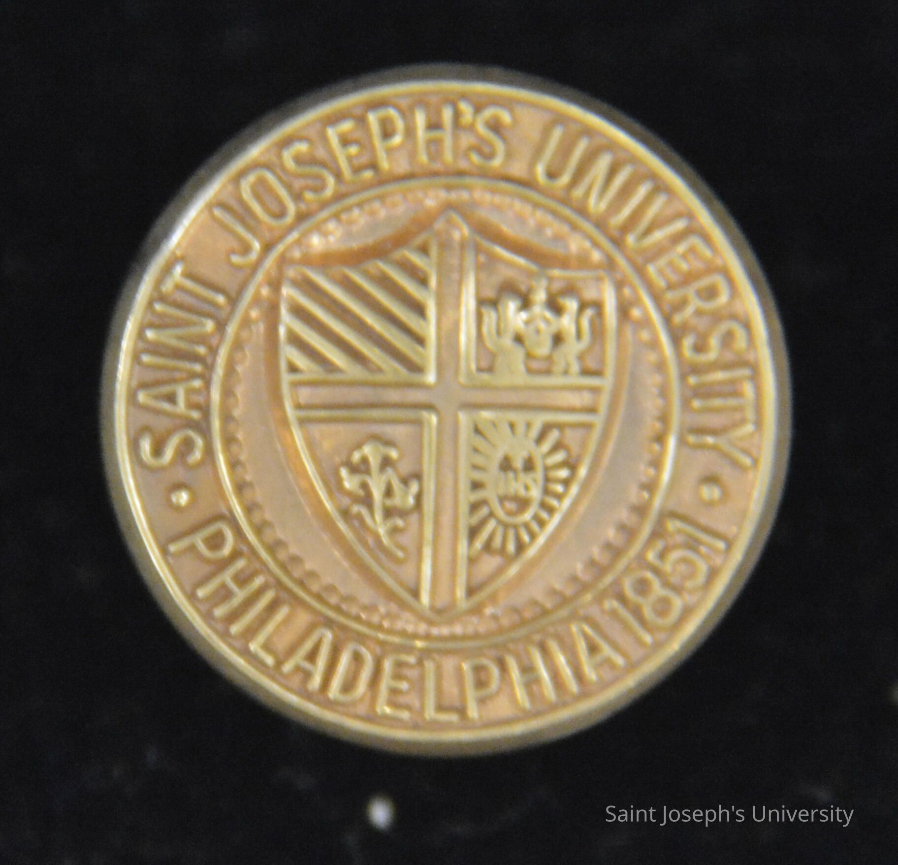 Two round copper tie tacks with the SJU seal on front. The back is blank. One of the tacks is missing its chain.
