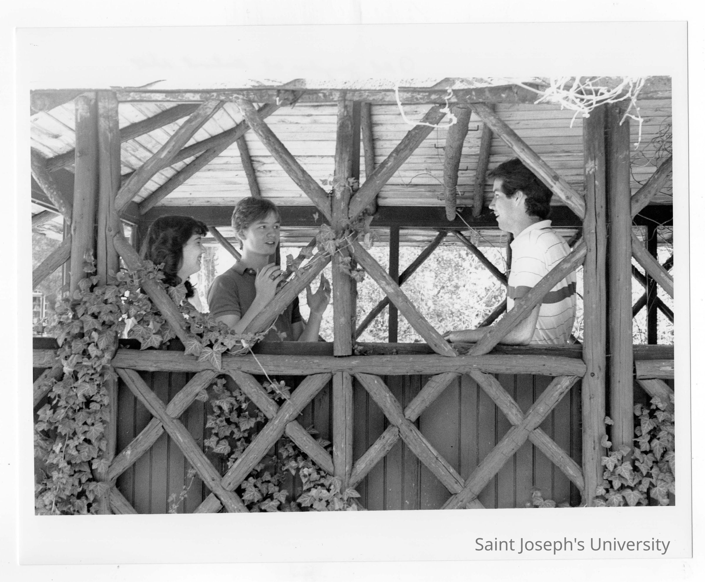 Students talking in old gazebo of Boland Hall.