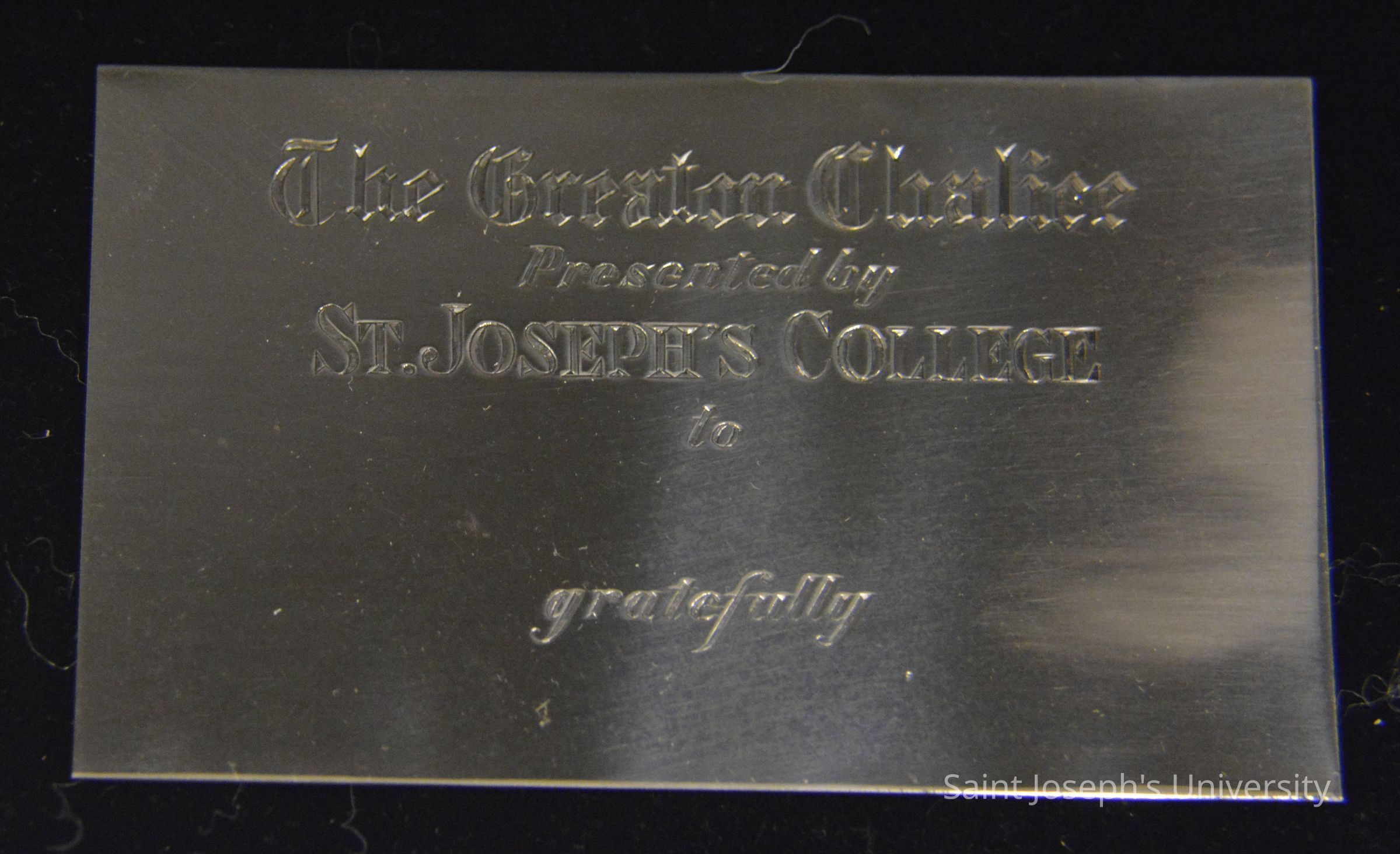 Silver rectangle shaped plaque noting "THE GREATON CHALICE PRESENTED BY ST. JOSEPH'S COLLEGE TO...GRATEFULLY..." The back is plain with remains of tape.