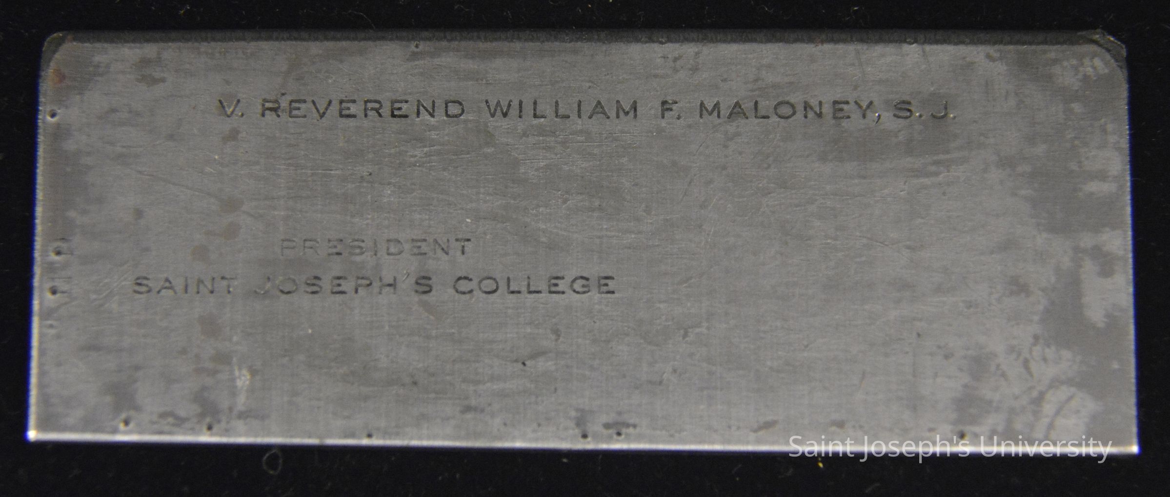 Metal name plate for printing business cards. Engraved with "V. REV. WILLIAM F. MALONEY, S.J. PRESIDENT, SAINT JOSEPH'S COLLEGE." The back is plain.