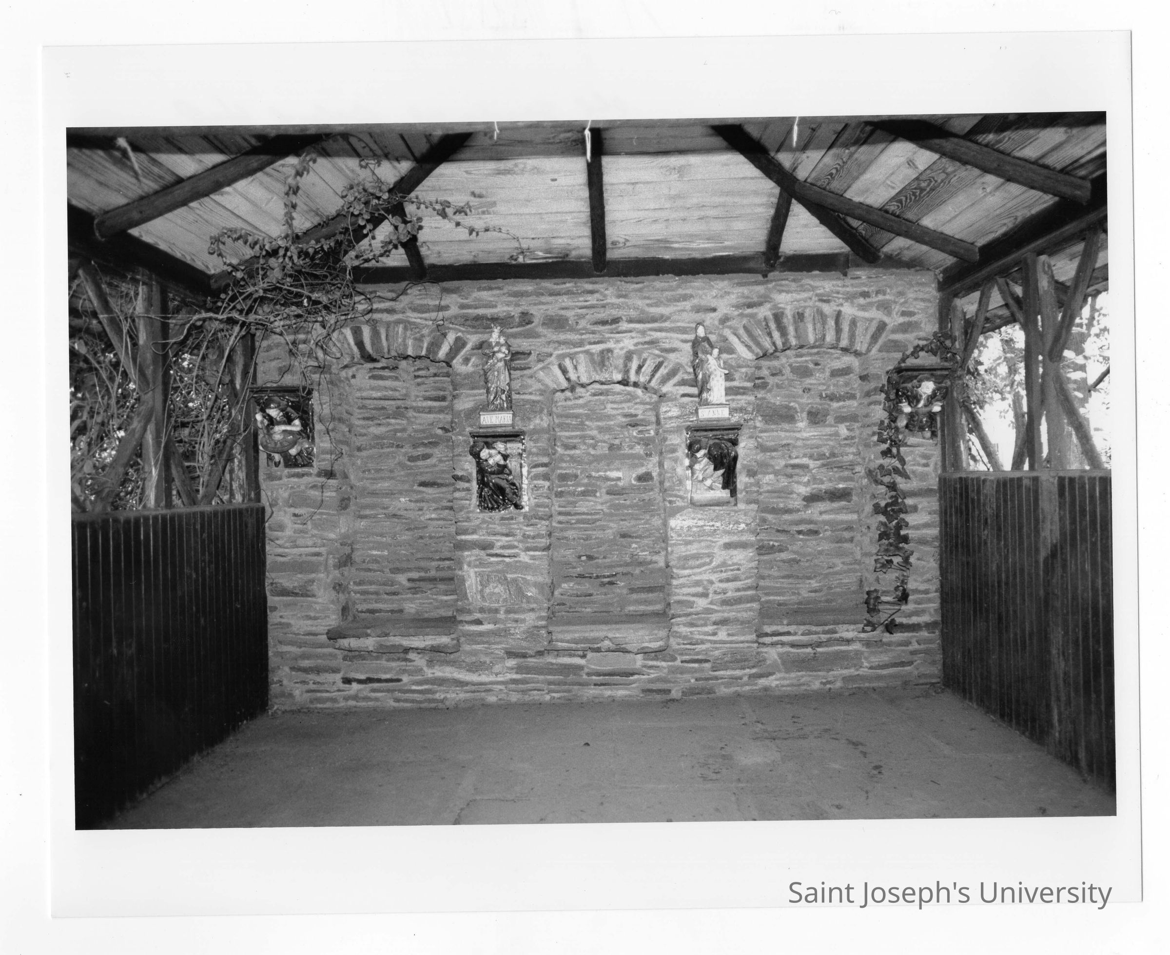 Interior of old gazebo with stone wall and ceramic sculpture of Boland Hall.