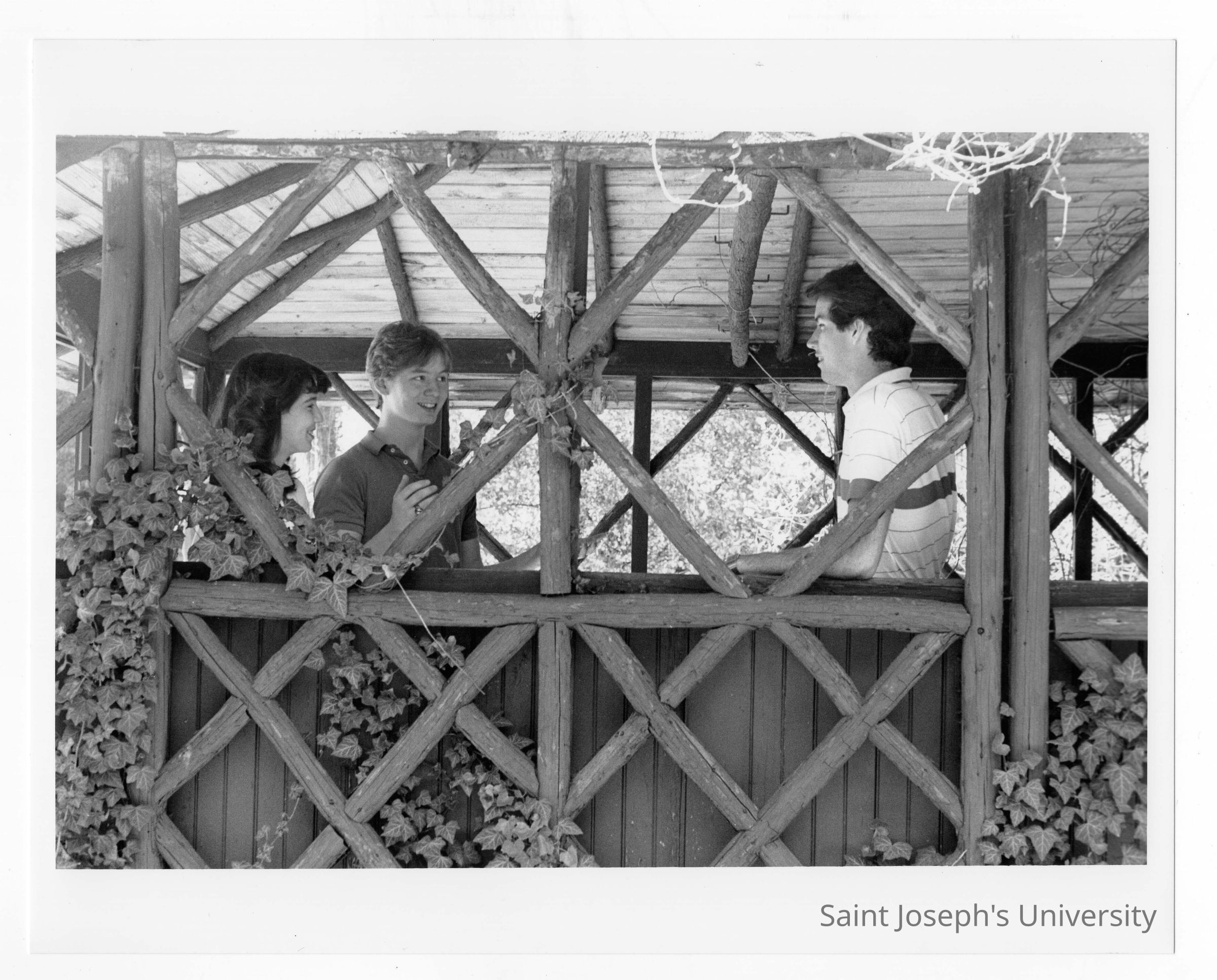Students talking in old gazebo of Boland Hall.
