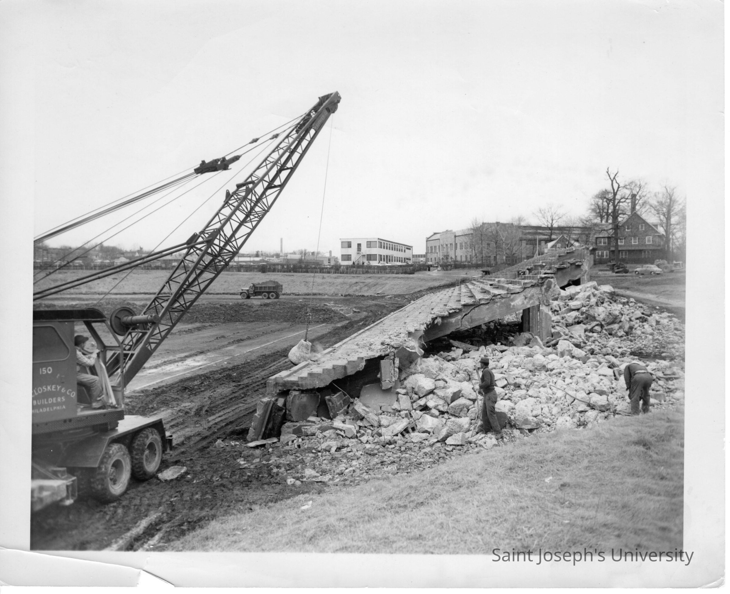 Finnesey Field preparation with crane destroying stands with Field House and Cardboard College in background.