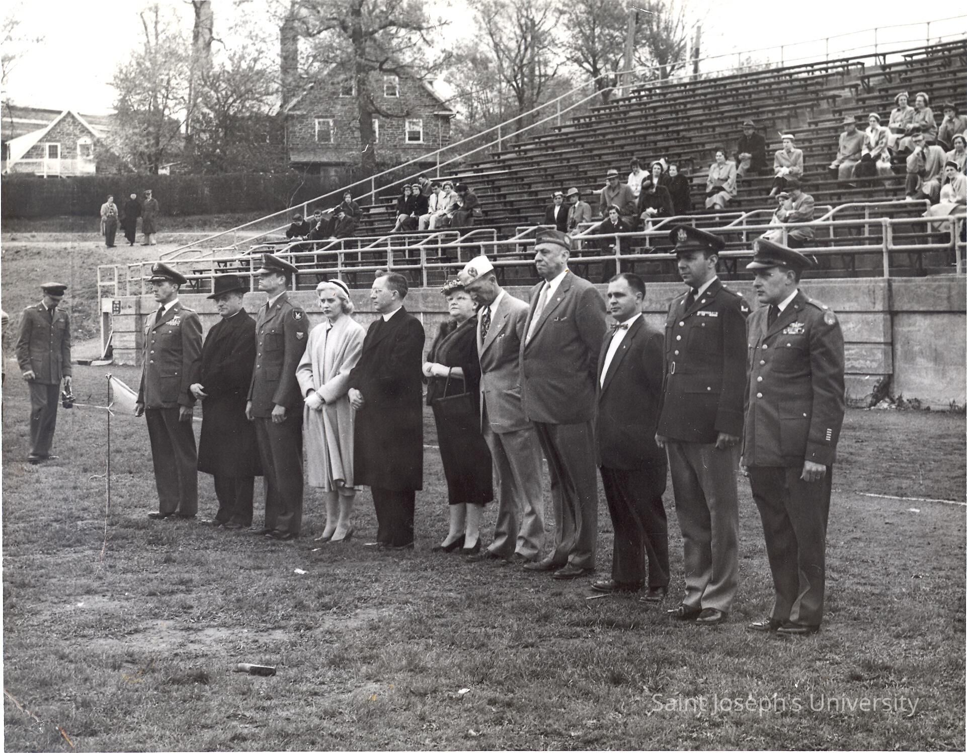 Veterans Day ceremony on Finnesey Field with Edward G. Jacklin, S.J. and others.