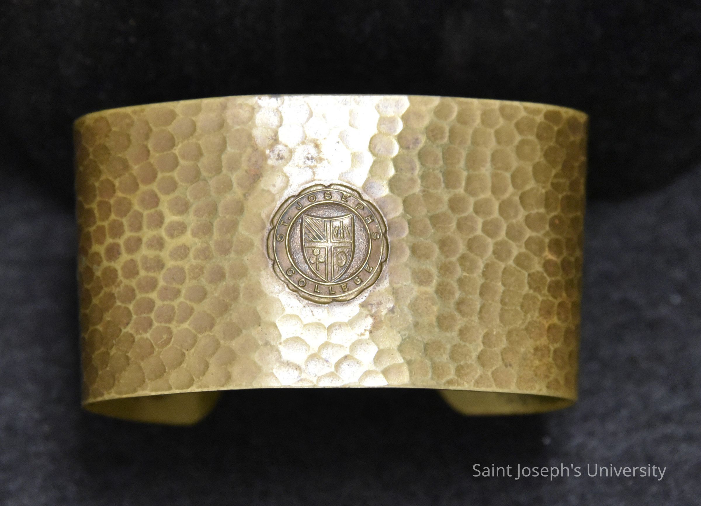 Bronze wrist cuff with hammered finish and SJC seal. Two small holes are at one end of the cuff and may have held a string of some kind to prevent the cuff from falling off.