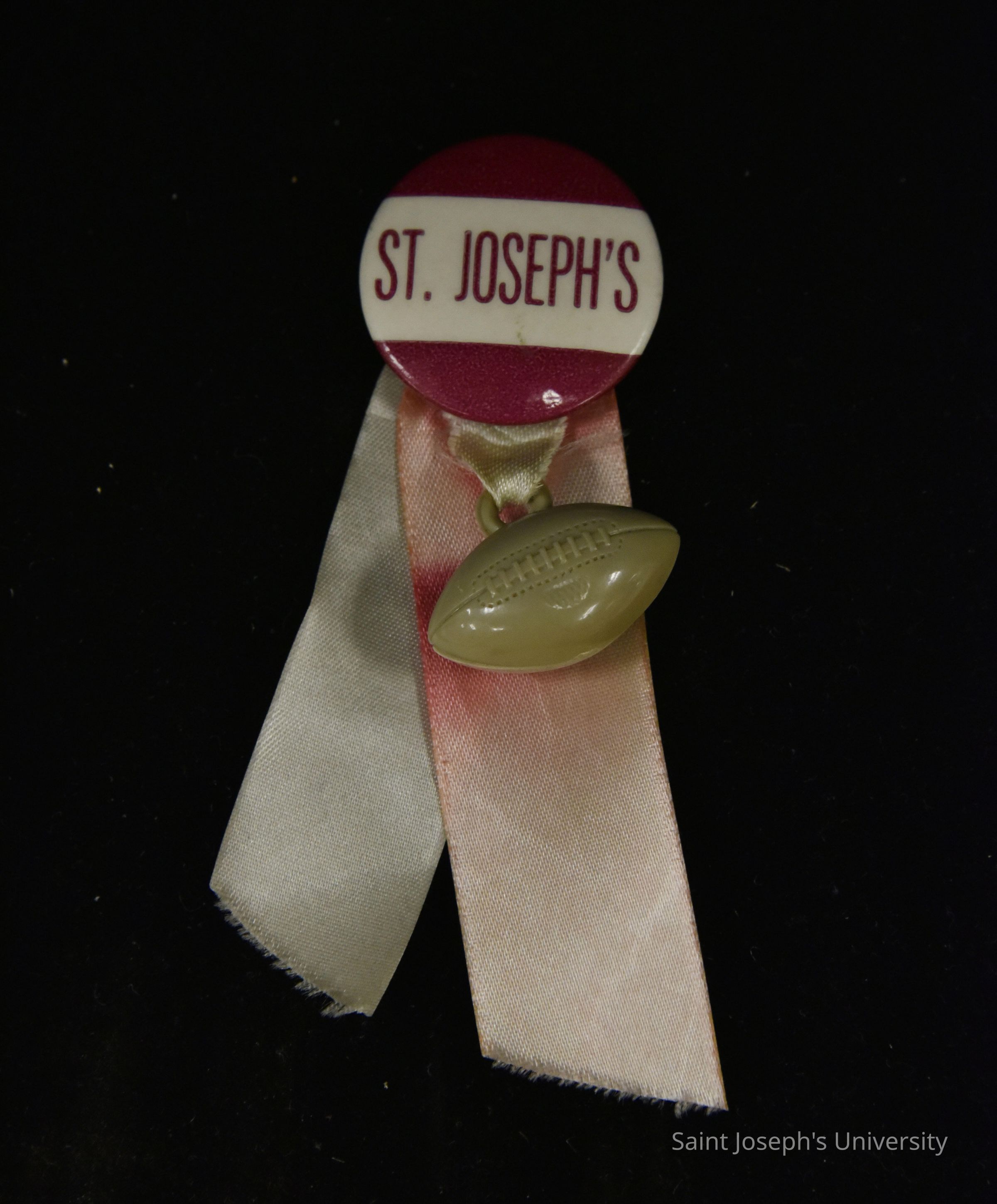 Small round red and white button with "ST. JOSEPH'S," attached faded red and white ribbon and small brown plastic football. Similar to 2013.OB.0376.