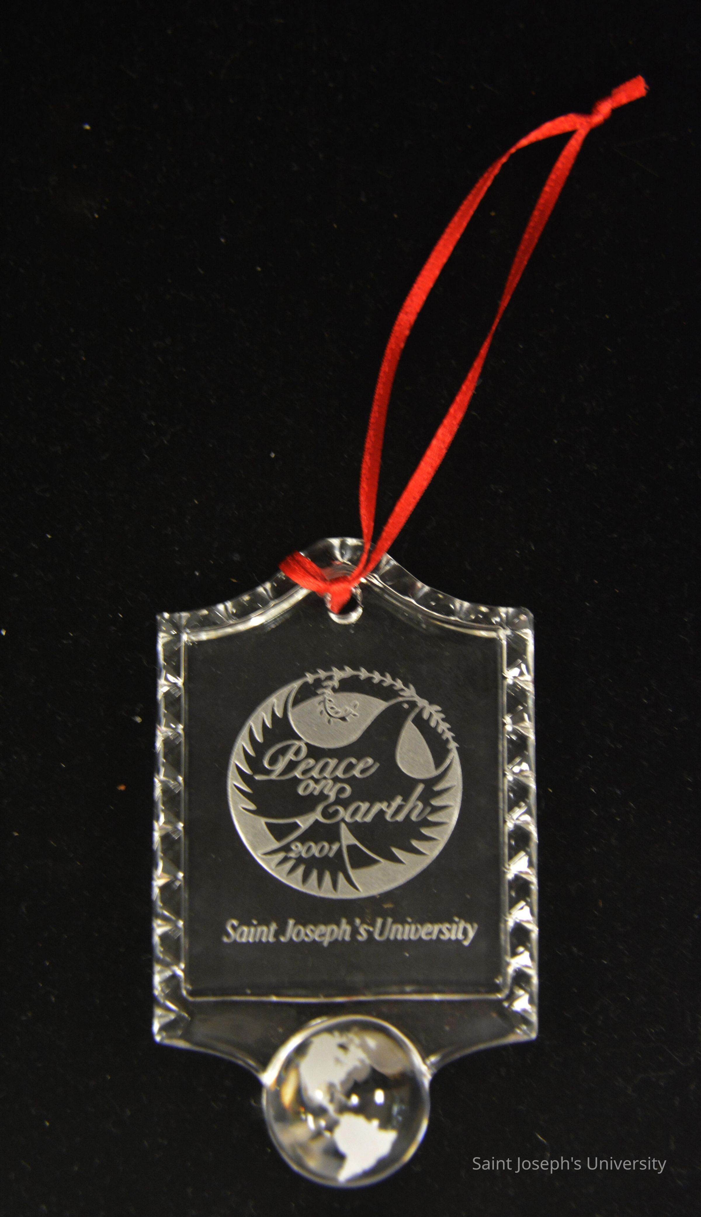 Glass tablet shaped ornament with a round globe at base and braided edges. Etched in the tablet is a decorative circle with an image of dove with "PEACE ON EARTH 2001" placed inside. "SAINT JOSEPH'S UNIVERSITY" is etched at the base of the tablet.