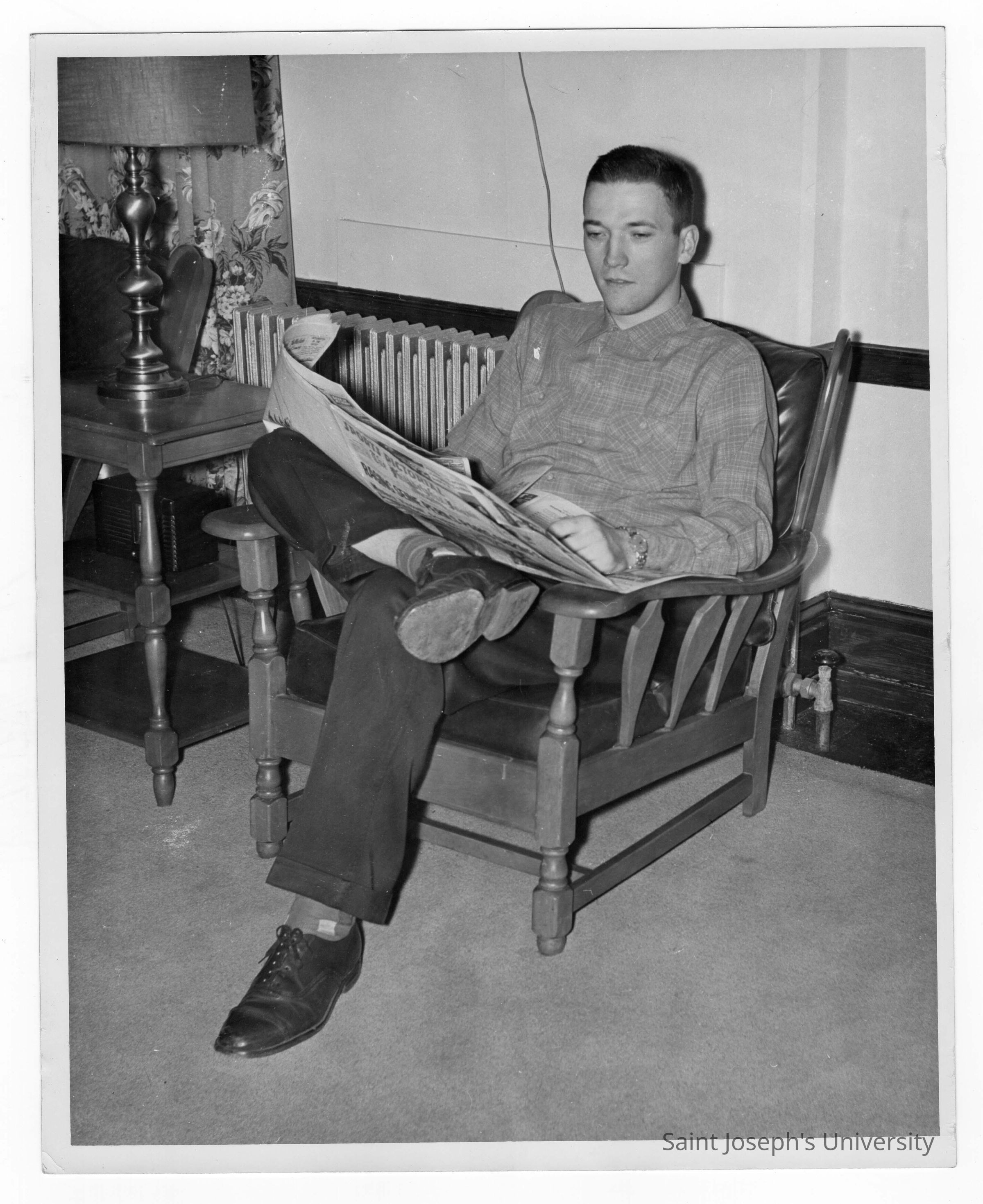 Student resident of Quirk Hall reading newspaper in living room.