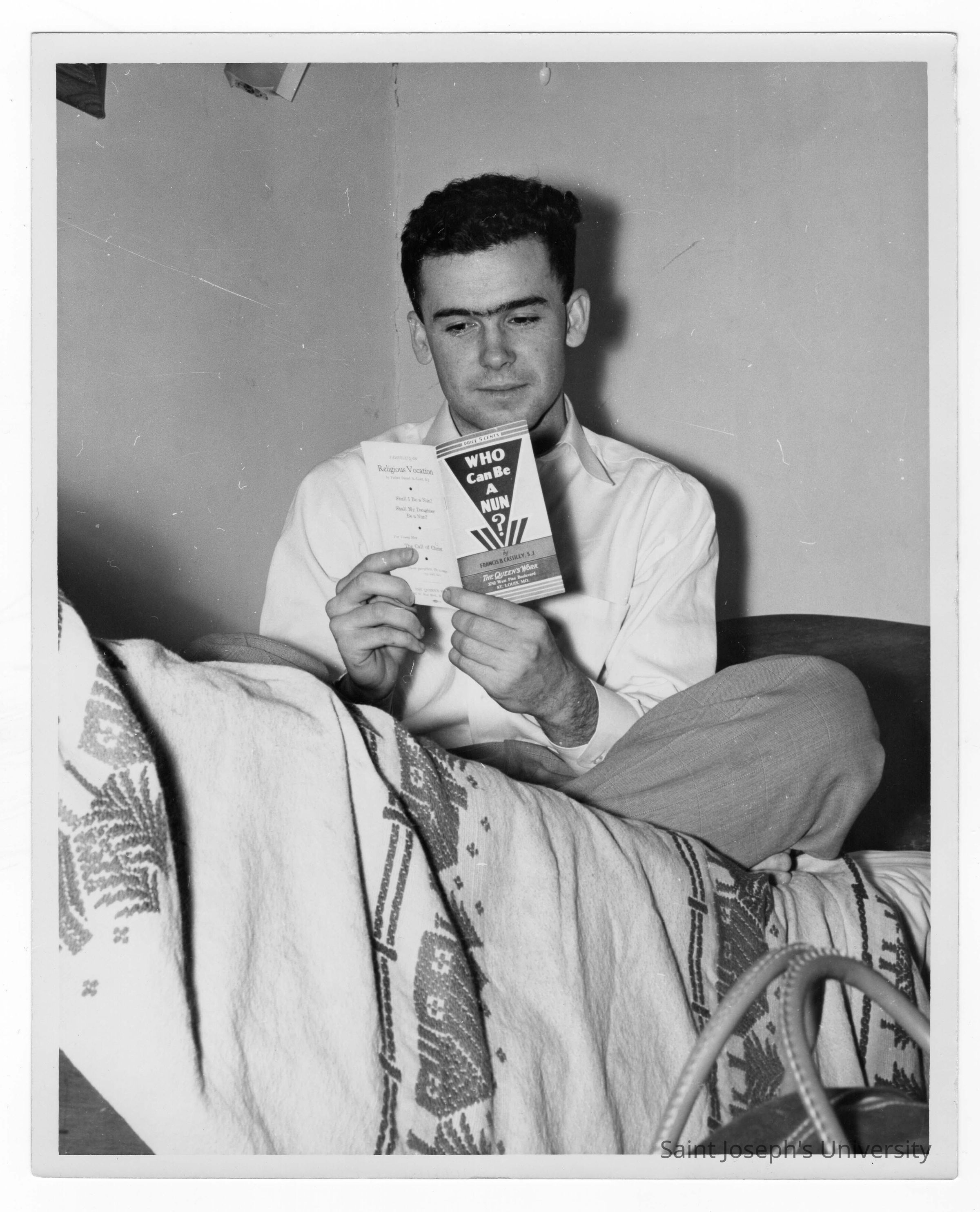 Student resident of Quirk Hall reading "Who Can Be a Nun" in dormitory room.
