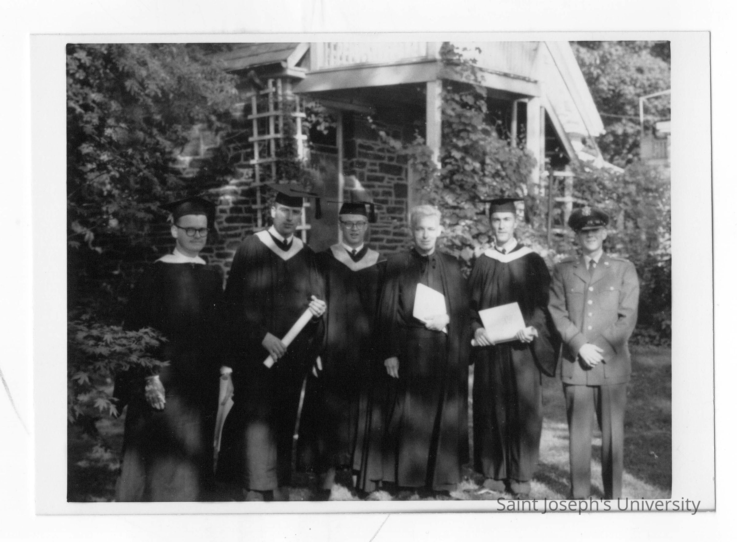Several graduating students of Quirk Hall with Francis J. Emory, S.J.