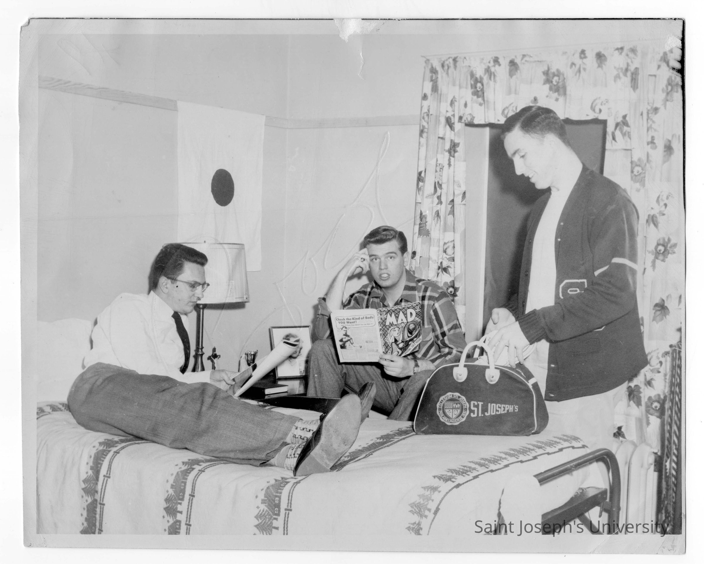Interior view of dormitory room in Barry Hall with Charles Tymon, Myles Thomas McDonald, and William Lynch.