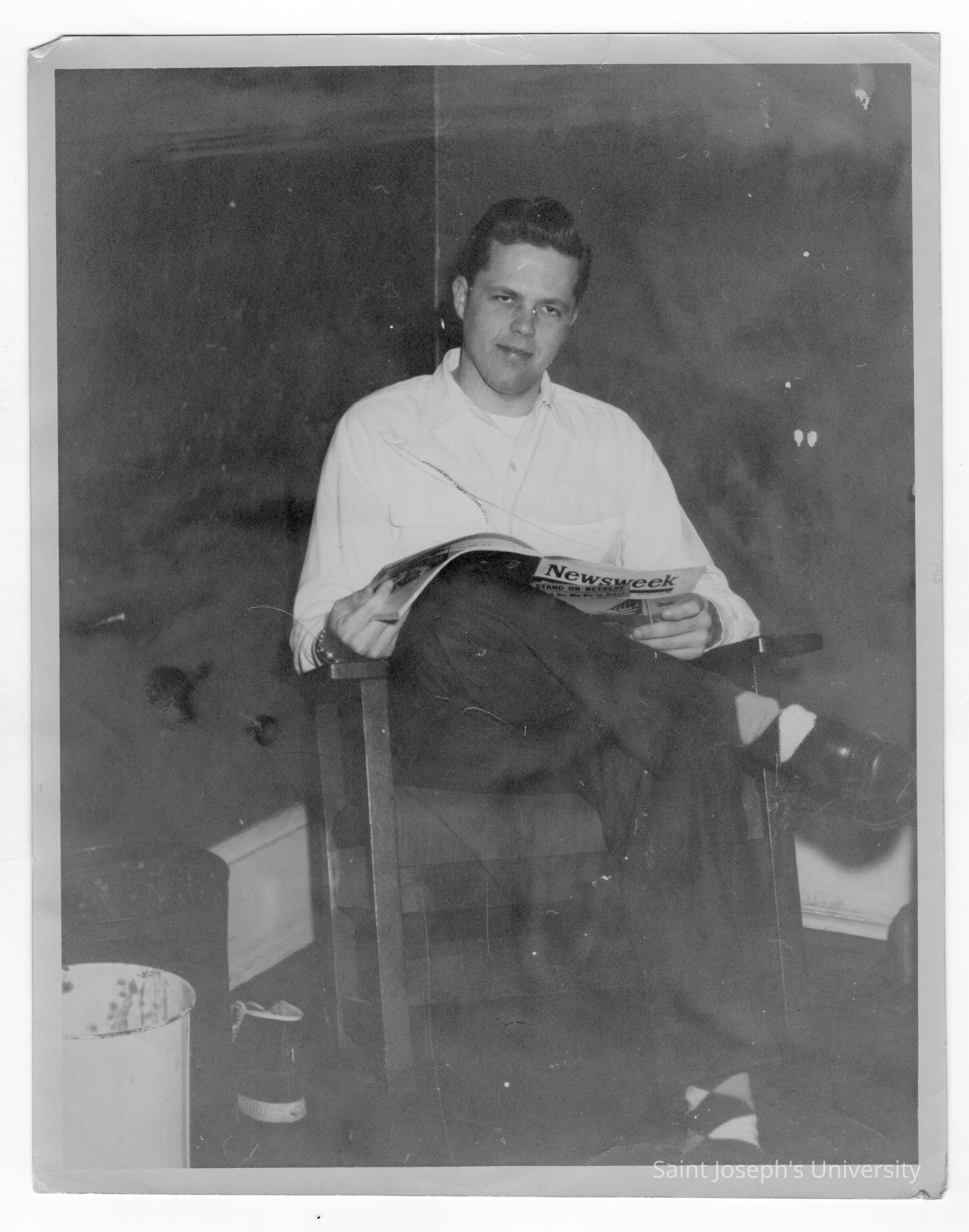 Student from Barry Hall reading Newsweek magazine in dormitory room.