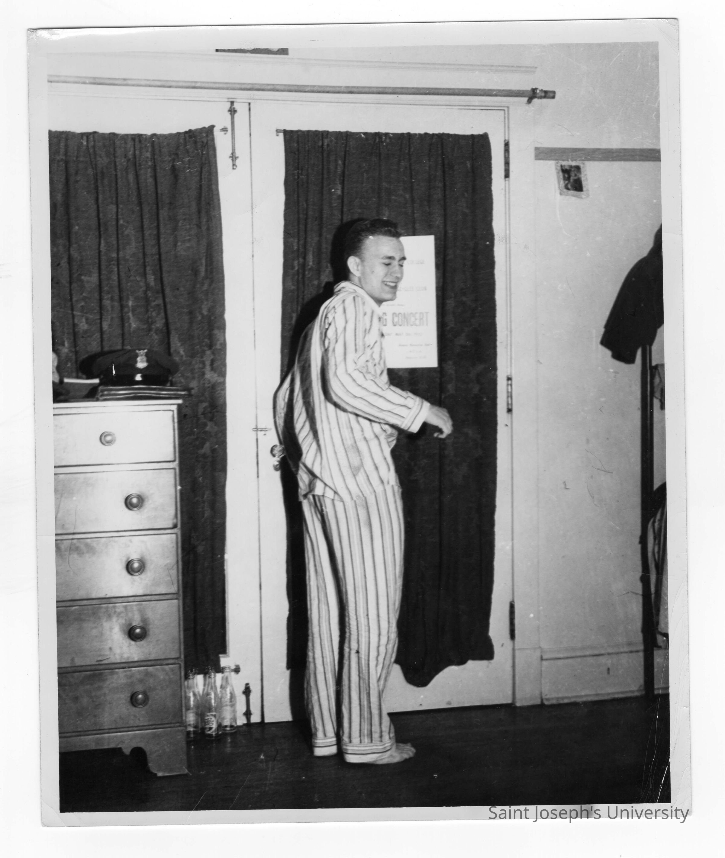 Student resident of Barry Hall in pajamas in dormitory room.