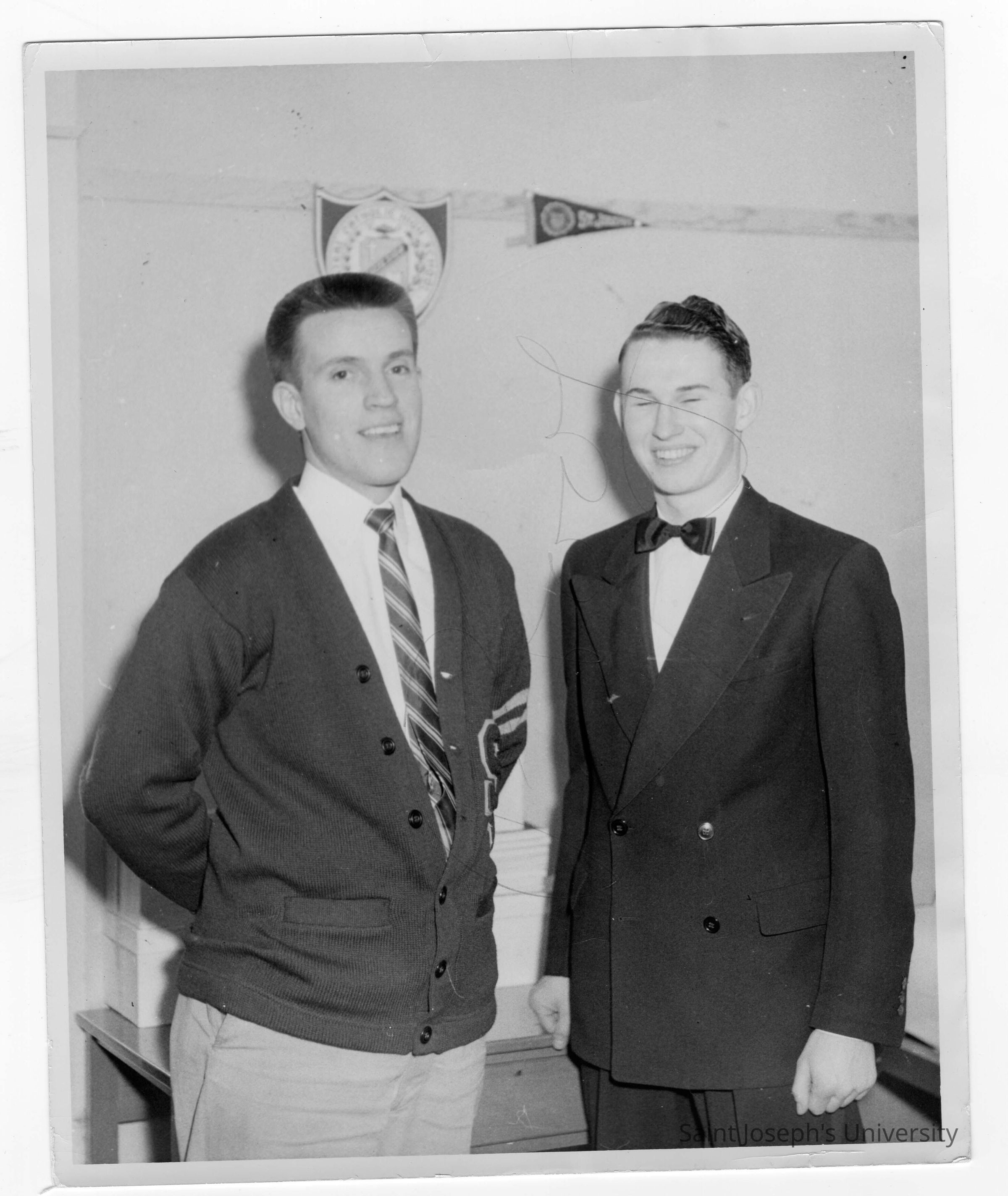 Two students of Barry Hall, one wearing letter sweater and the other a tuxedo.