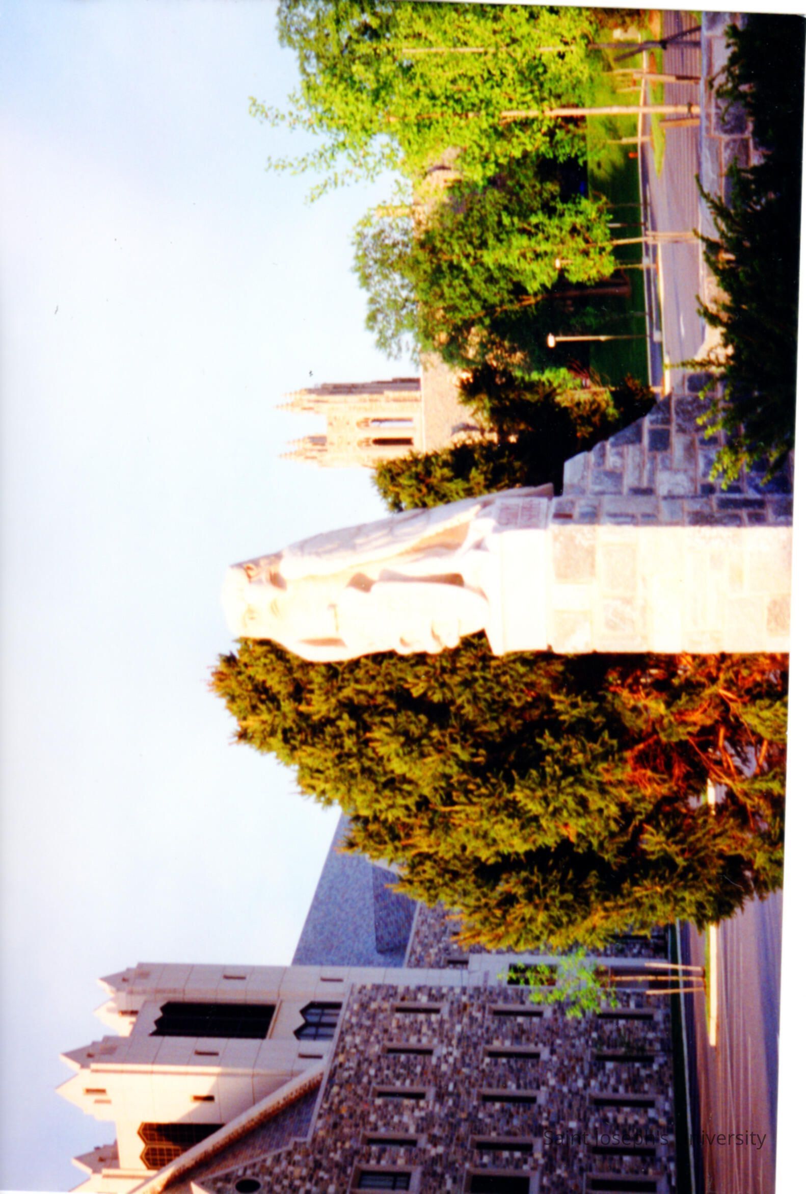 View of carved mascot hawk in front of Mandeville Hall with Barbelin Tower in distance.