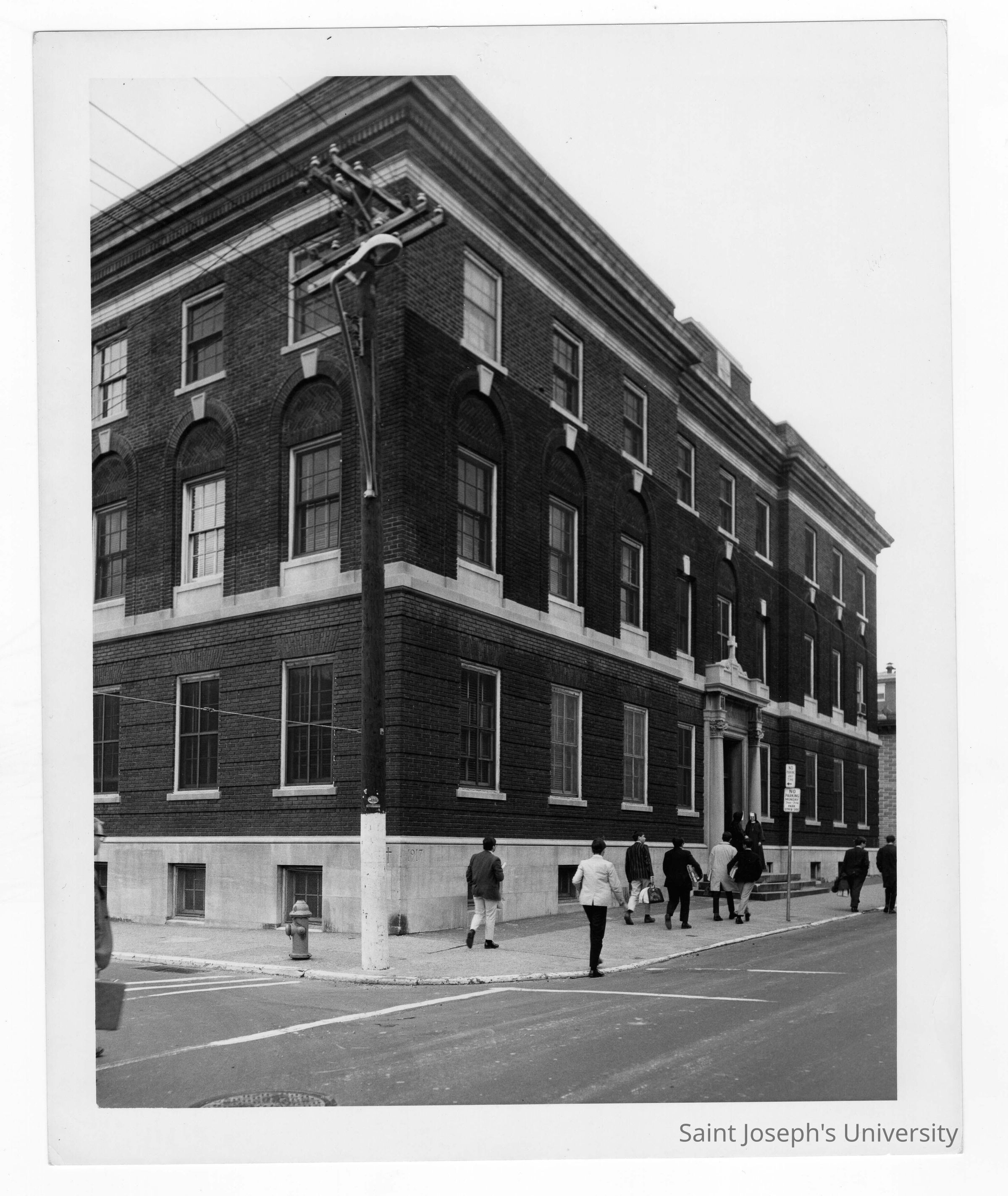 Students wearing coat and tie walking in front of Gesu Convent in Philadelphia with nun standing at doorway.
