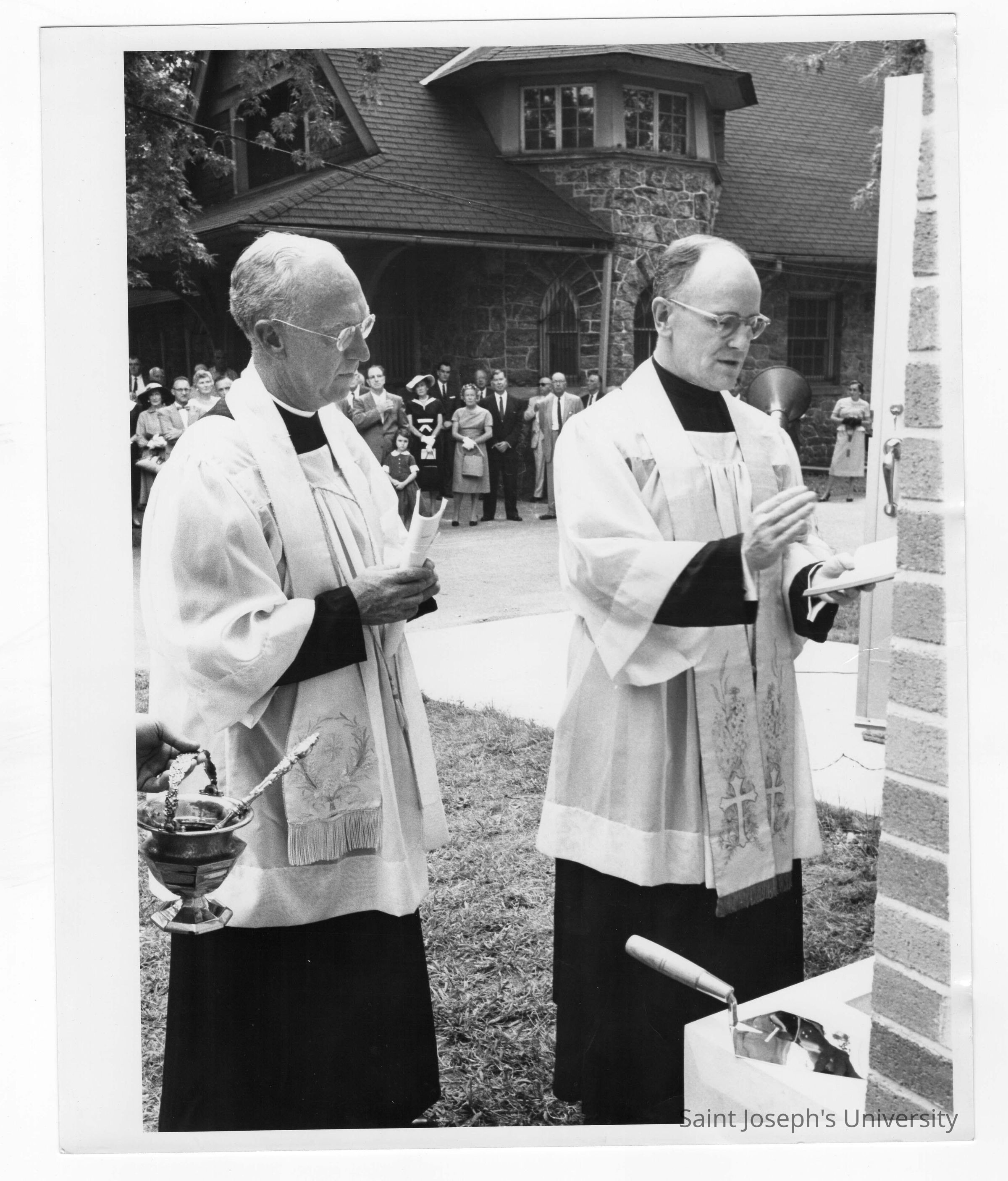 Laying and blessing of cornerstone of new Jesuit faculty residence with J. Joseph Bluett, S.J. and guests and Loyola in background