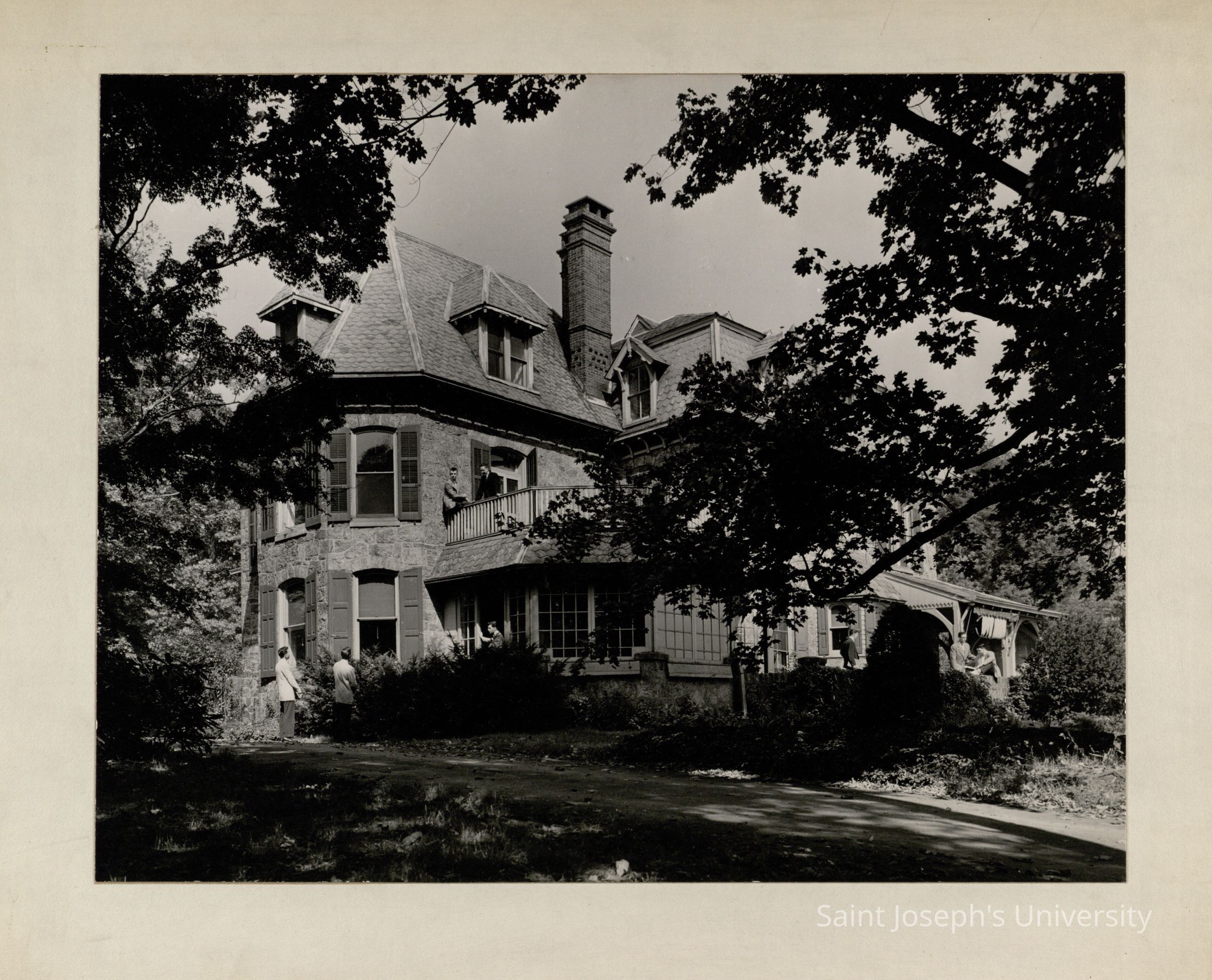 Exterior view of Quirk Hall with several students standing on lawn and on porches.