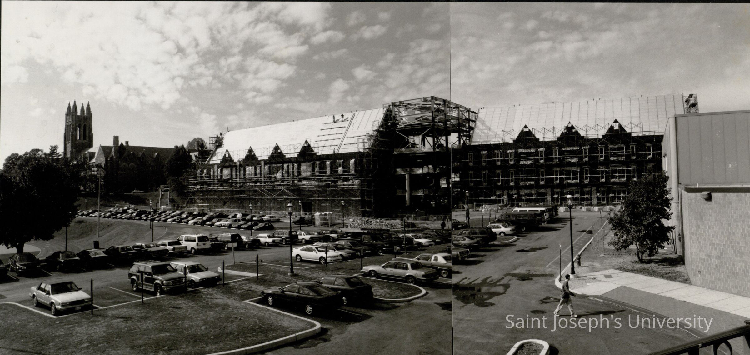 Exterior view of back of Mandeville Hall under construction as seen from parking lot near Field House with Barbelin Tower in background.