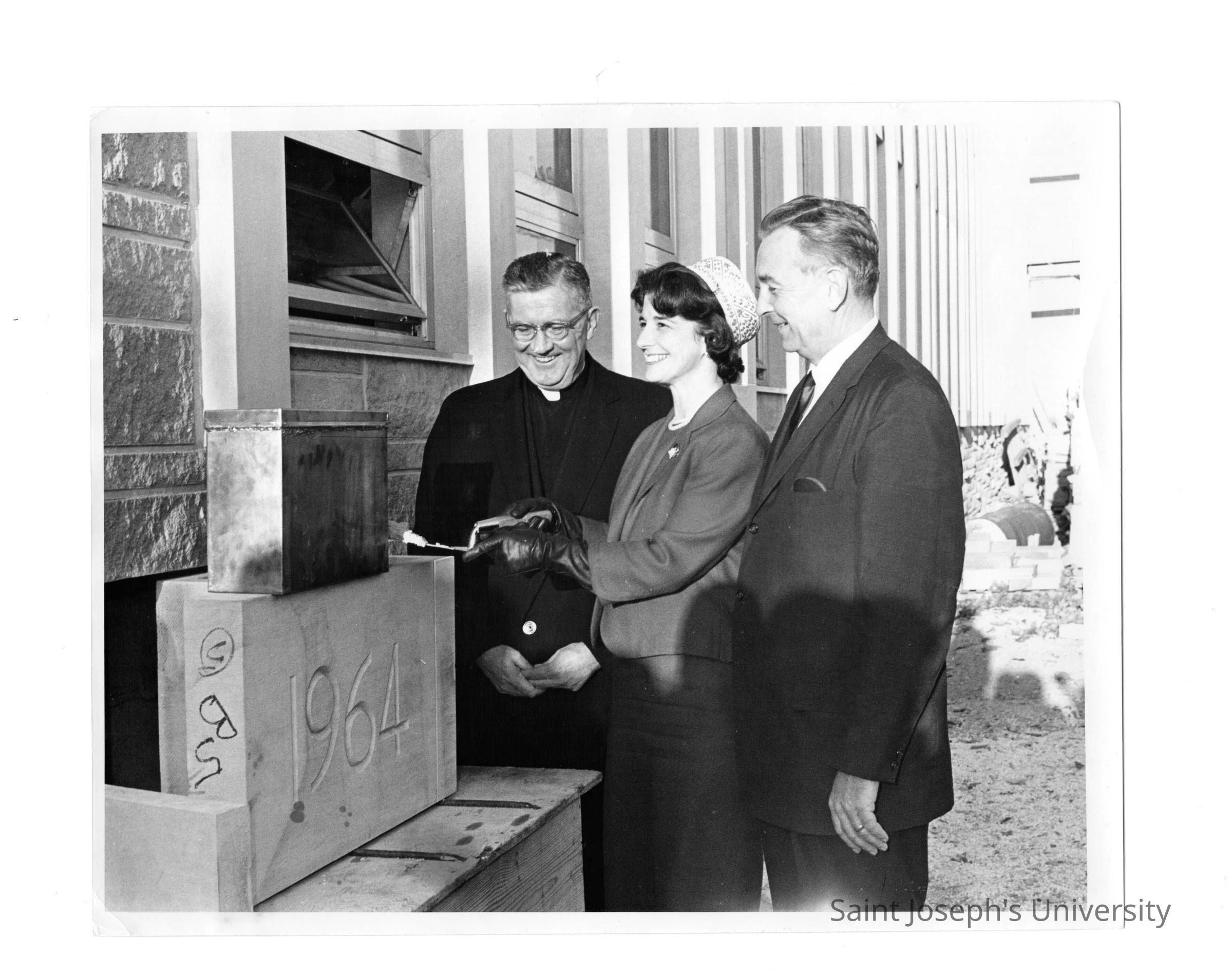 Villiger (later Post) Academy of Food Marketing dedication and laying of cornerstone with William F. Maloney, S.J., Herbert Sugden, and Mrs. Orville Freeman, November 1964.