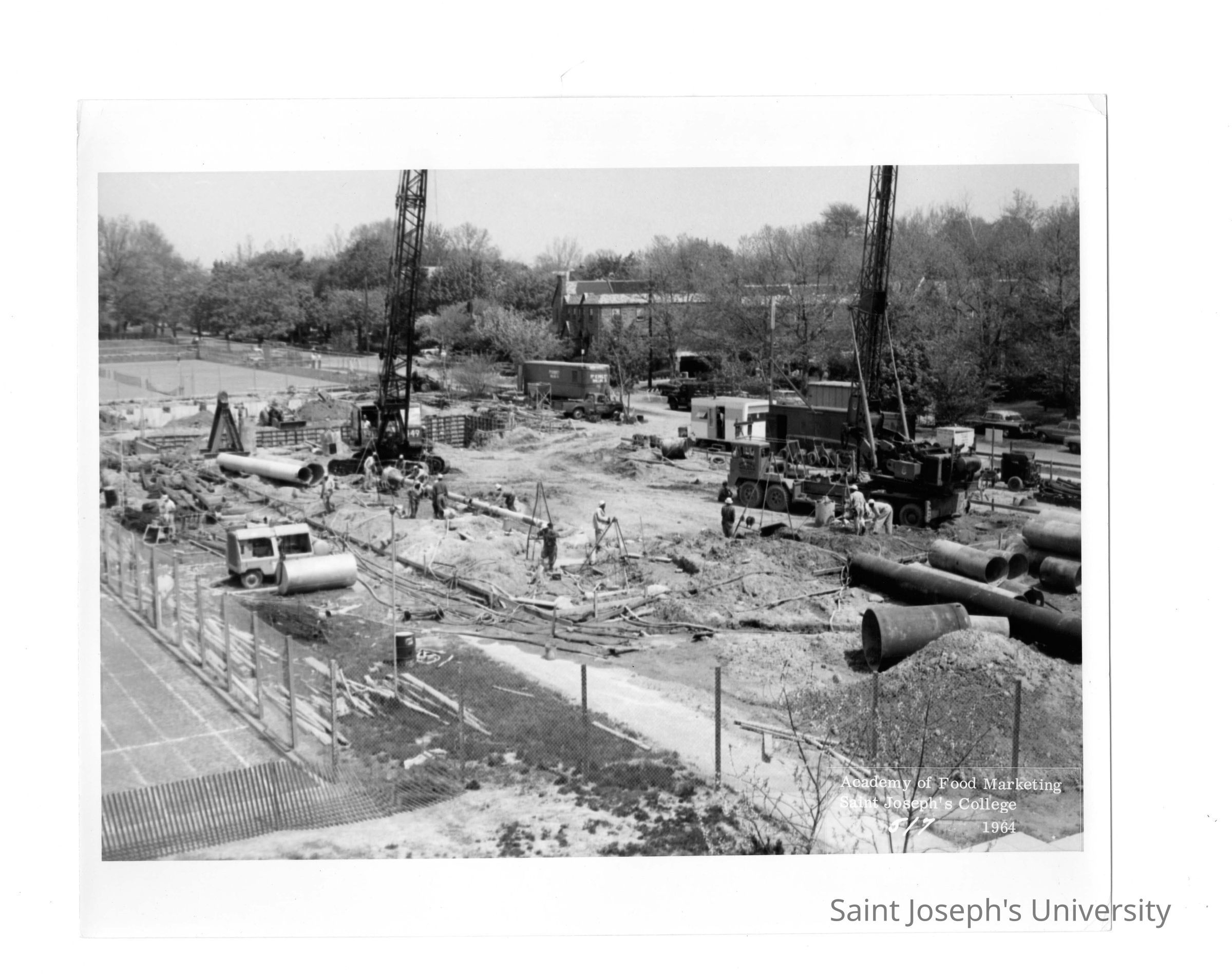 Early construction of Villiger (later Post) Academy of Food Marketing with workmen and equipment with tennis courts and neighborhood in background.