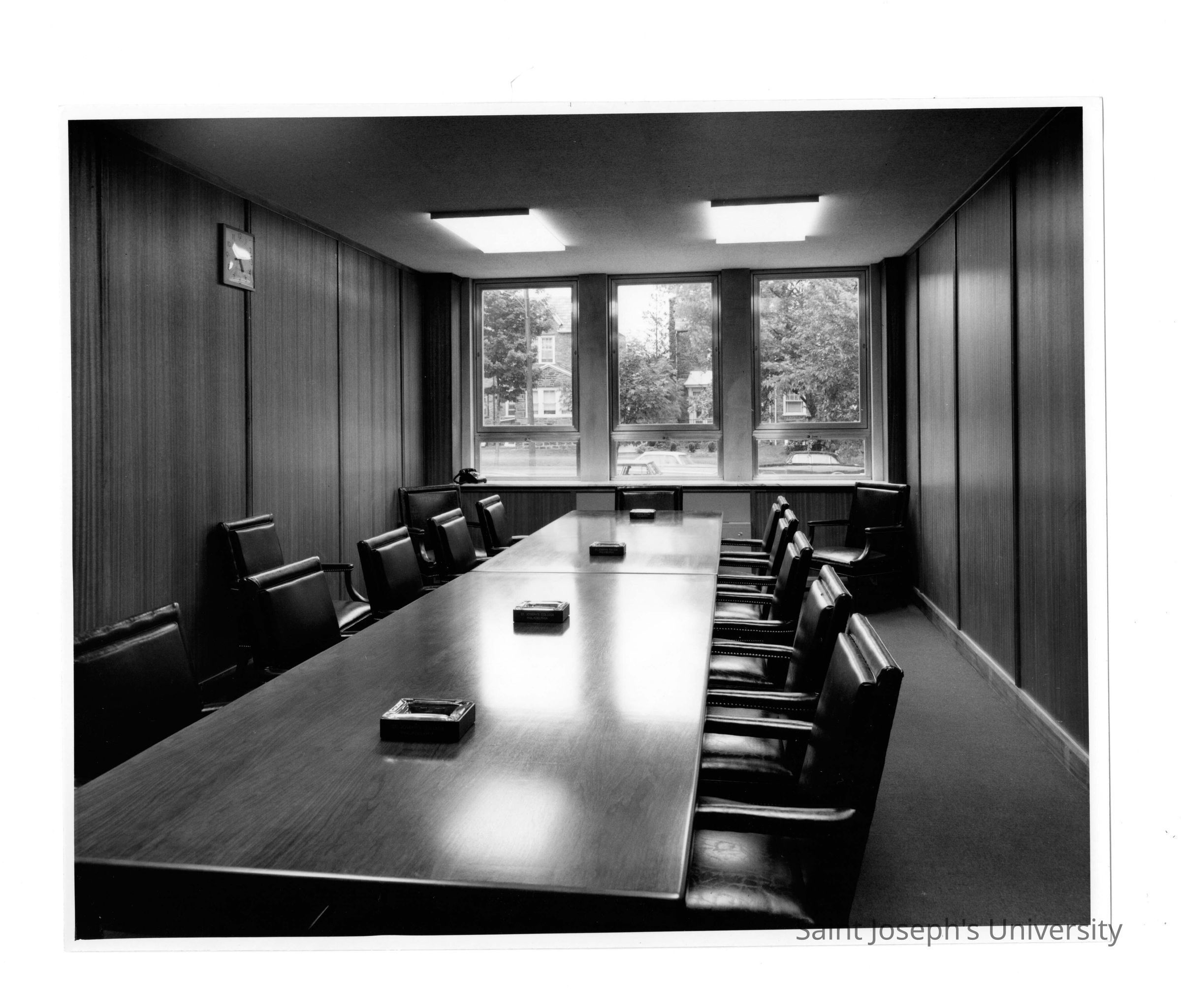 View of conference room in Villiger (later Post) Academy of Food Marketing with cigarette ashtrays on table.