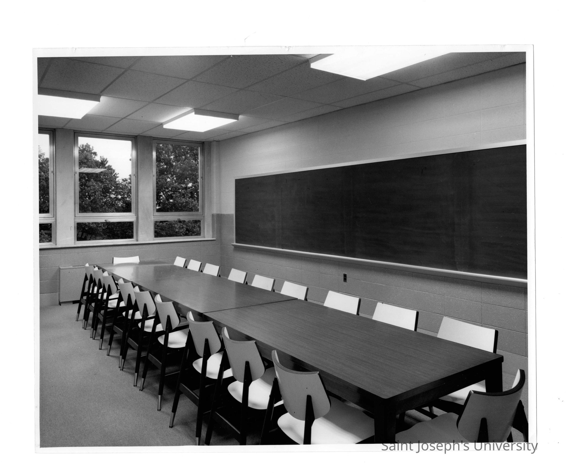 View of long conference tables in classroom of Villiger (later Post) Academy of Food Marketing.