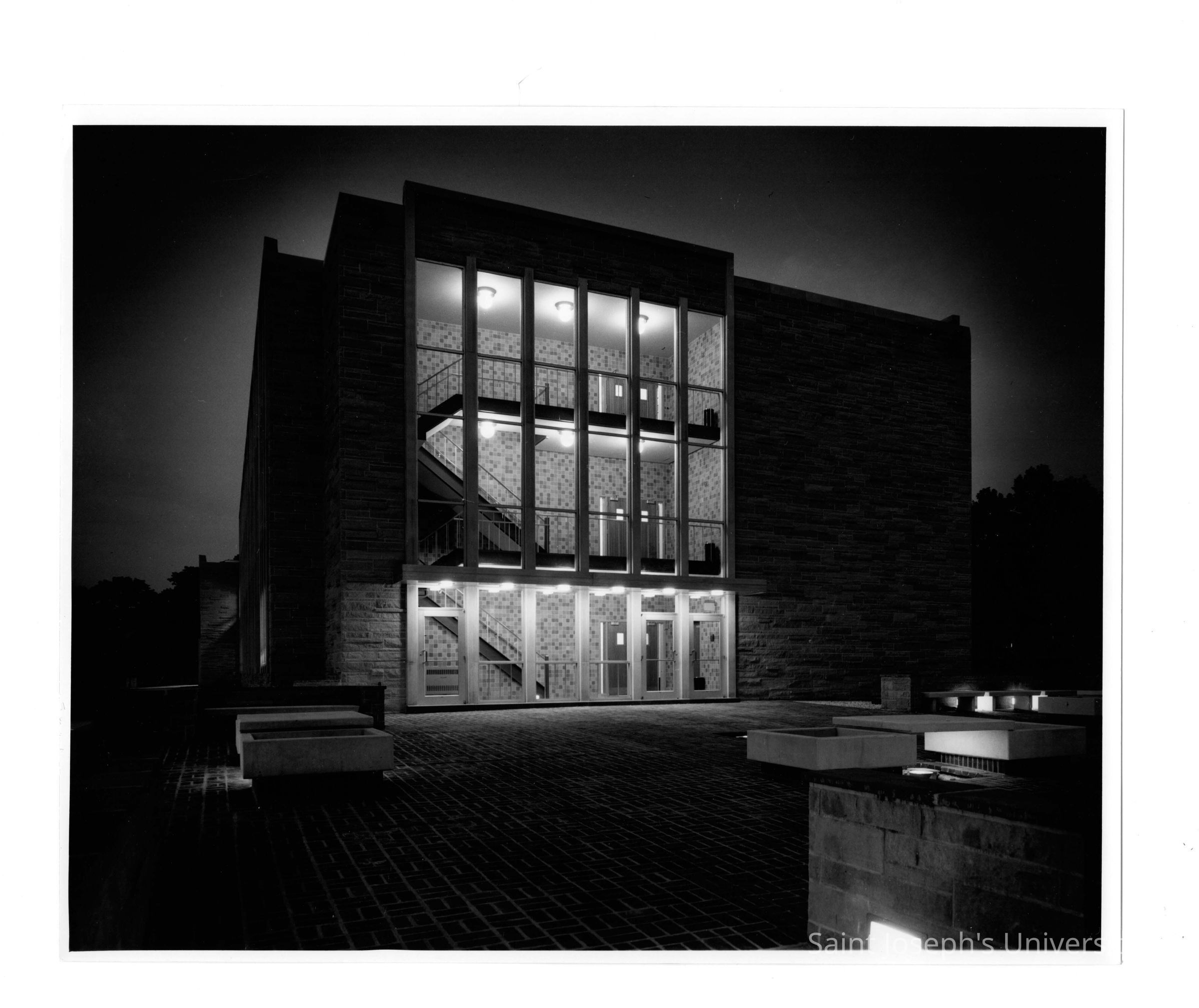 View of side entrance and interior stairwell of Villiger (later Post) Academy of Food Marketing at night.