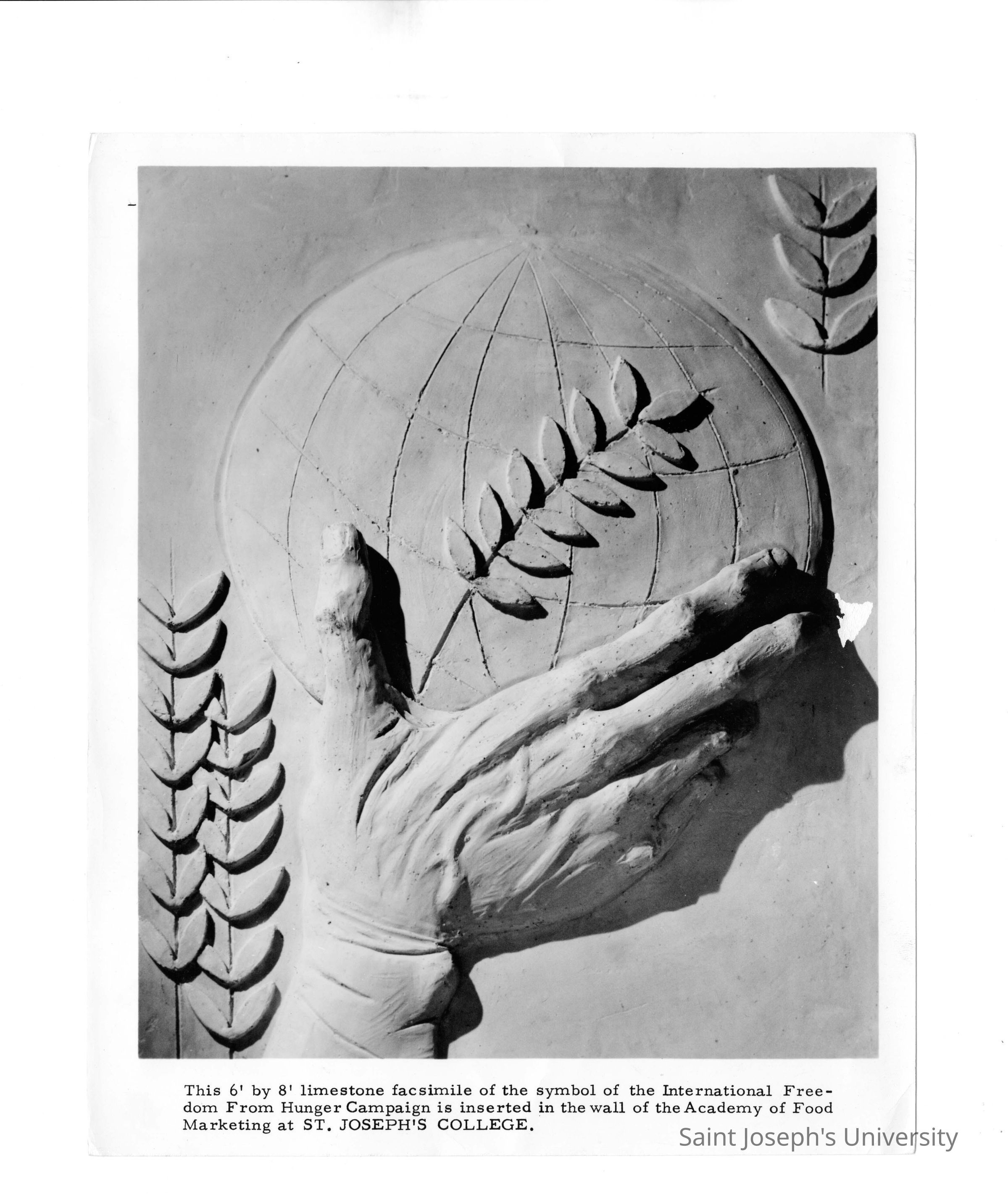 Limestone carving in Villiger (later Post) Academy of Food Marketing symbolizing international freedom from hunger campaign.