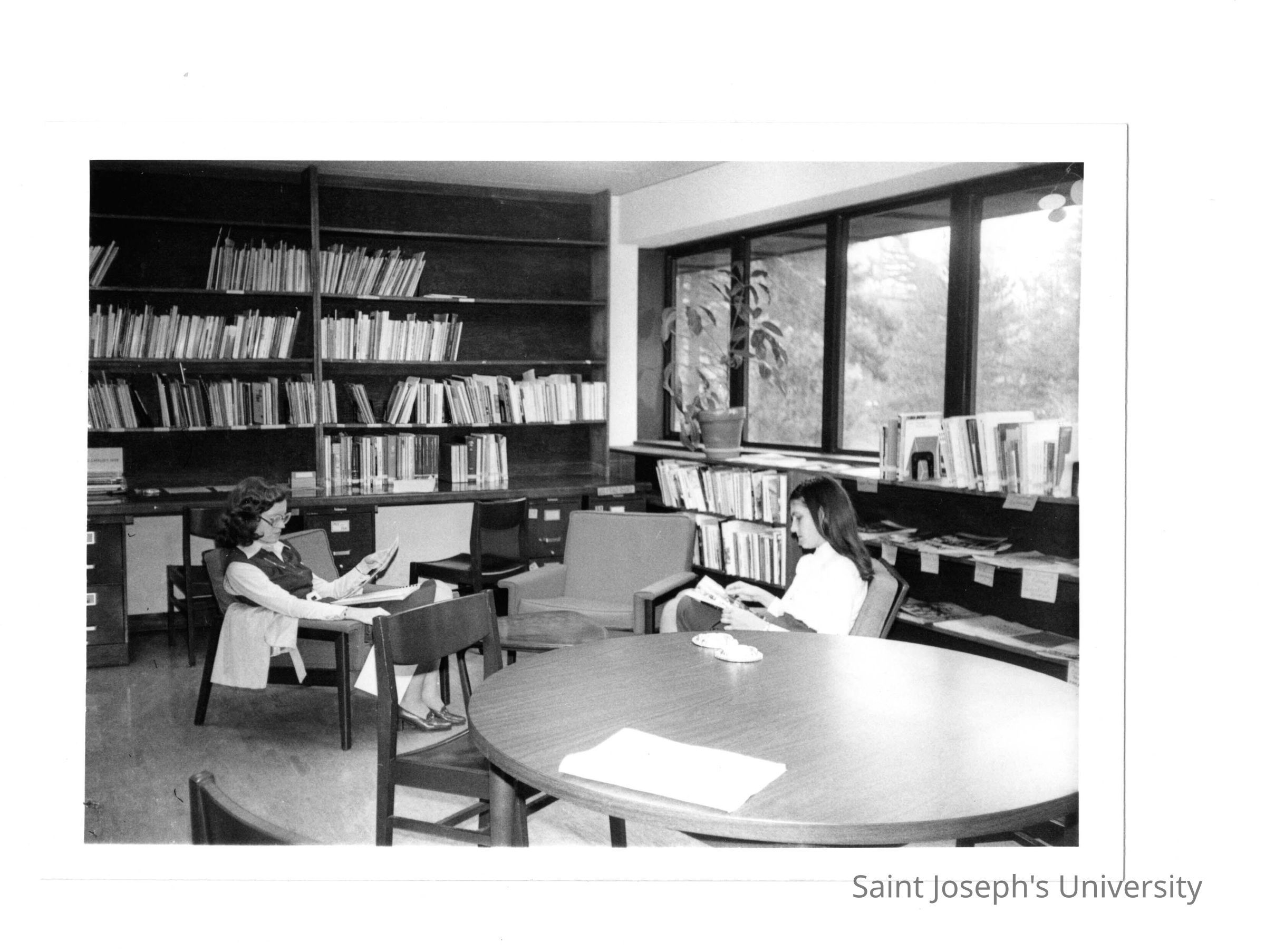 Two women studying in Campbell Library, Academy of Food Marketing, Villiger (later Post).