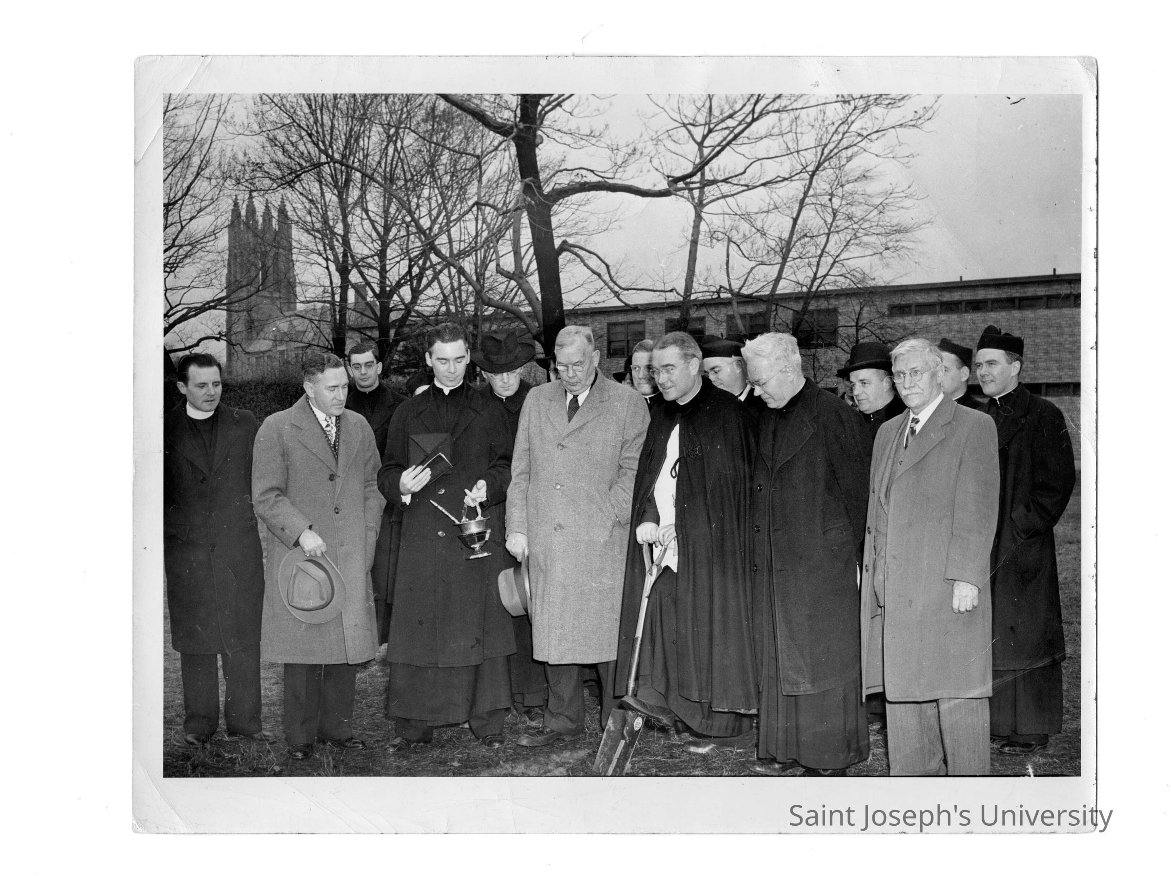 Groundbreaking for Field House (Sports Complex) with John Long,S.J., Howard Heim, S.J., James Buckley, S.J., Walter Hardren, S.J., Michael Maher, S.J., Thomas Stokes, S.J., John McShain, Fred Koehler, S.J., Joseph Hearn, S.J. with barracks in background.Entry/Object ID