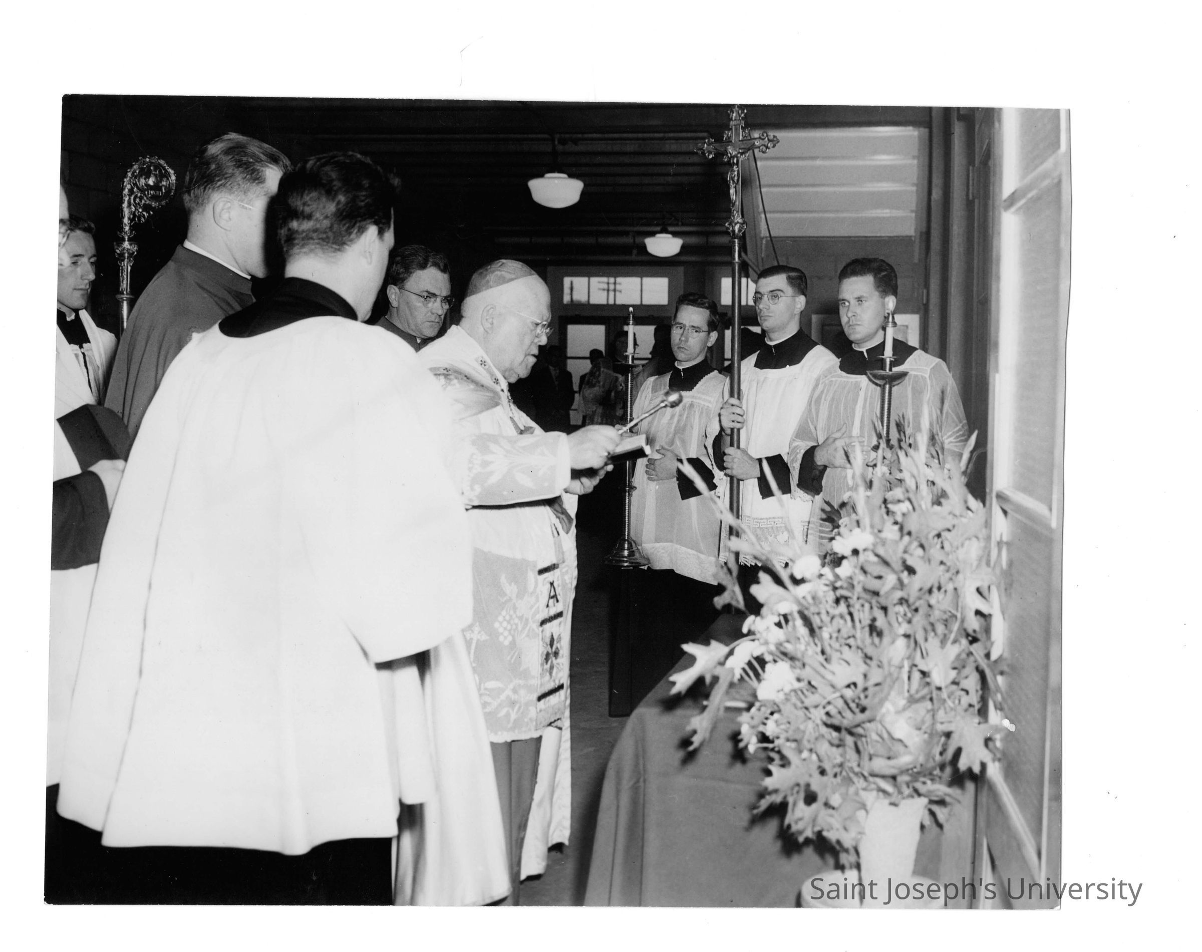 Interior view of Field House (Sports Complex) dedication with Dennis Cardinal Dougherty, Msgr. Francis Furey, John J. Long, S.J., William J. Byron, S.J. (class 1951), Bernard Lanin