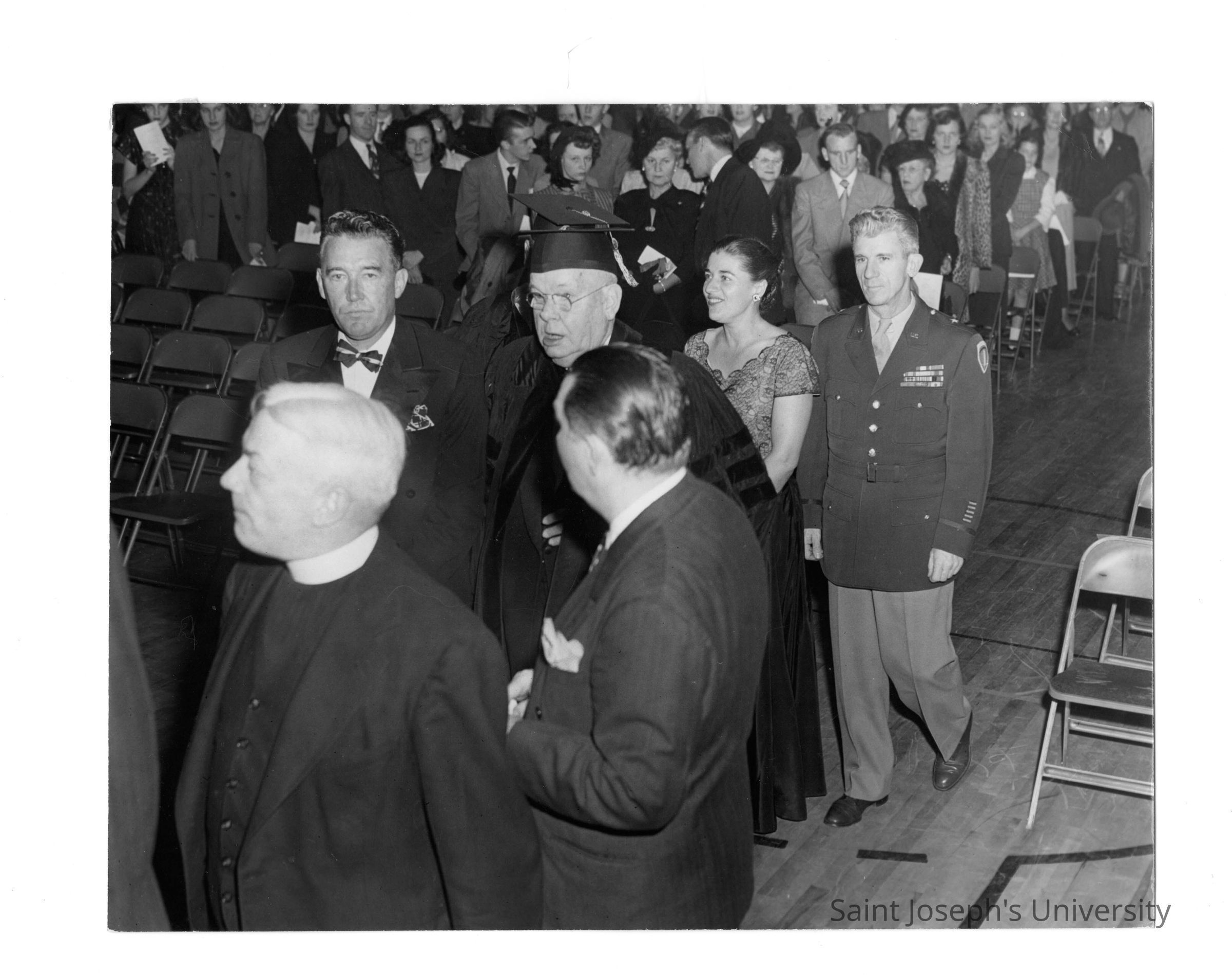 Interior view of Field House dedication with guests seated on basketball court and dignitaries on podium.