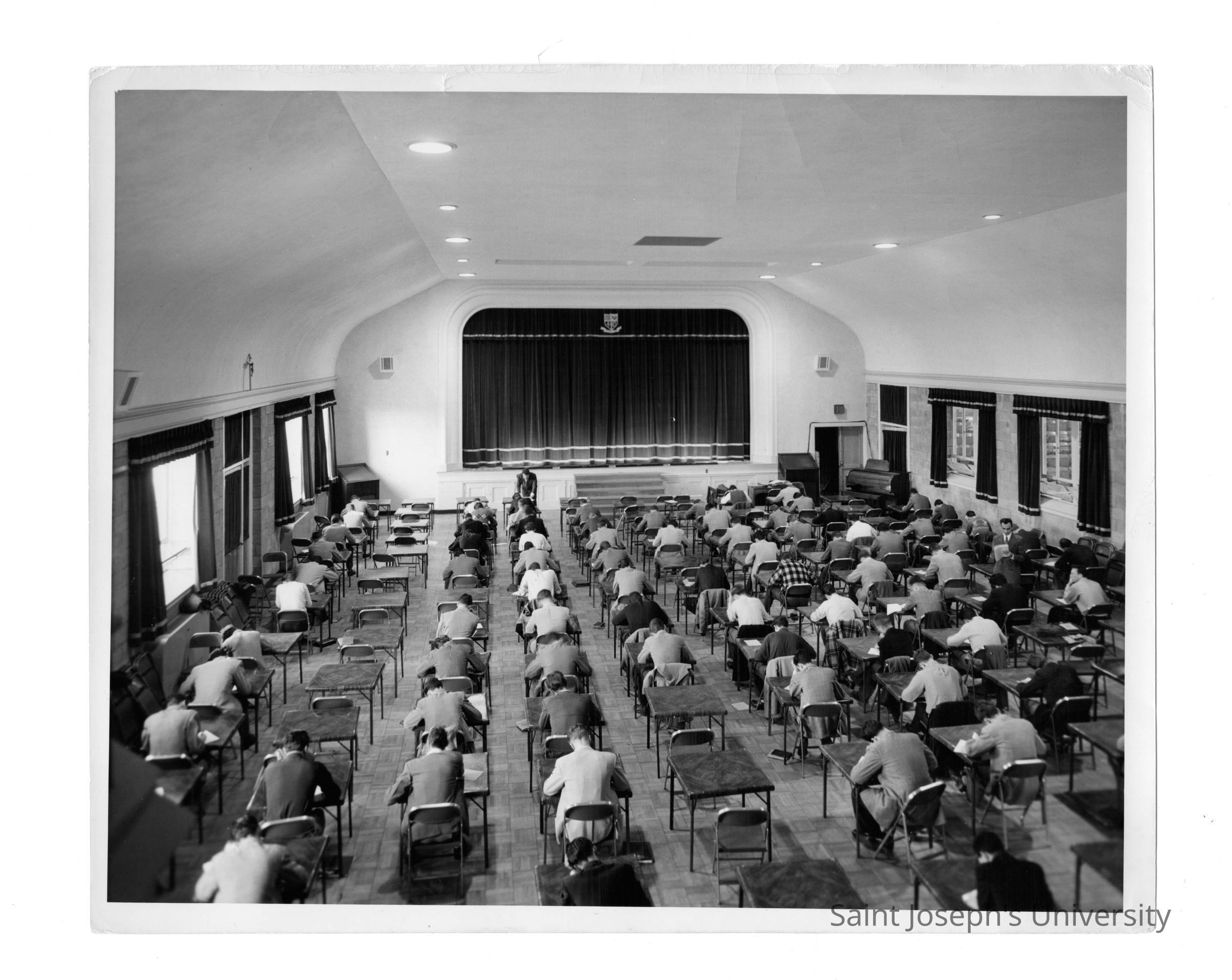 Flanigan Auditorium, Field House (Sports Complex) with students seated at individual folding tables taking test?