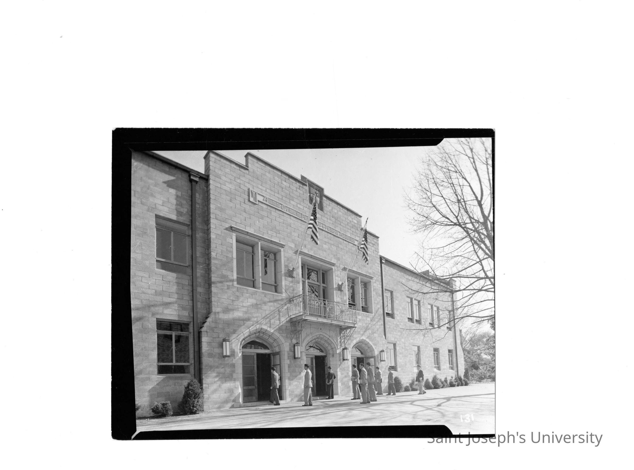 View of front entrance of Field House (Sports Complex) with students walking in.