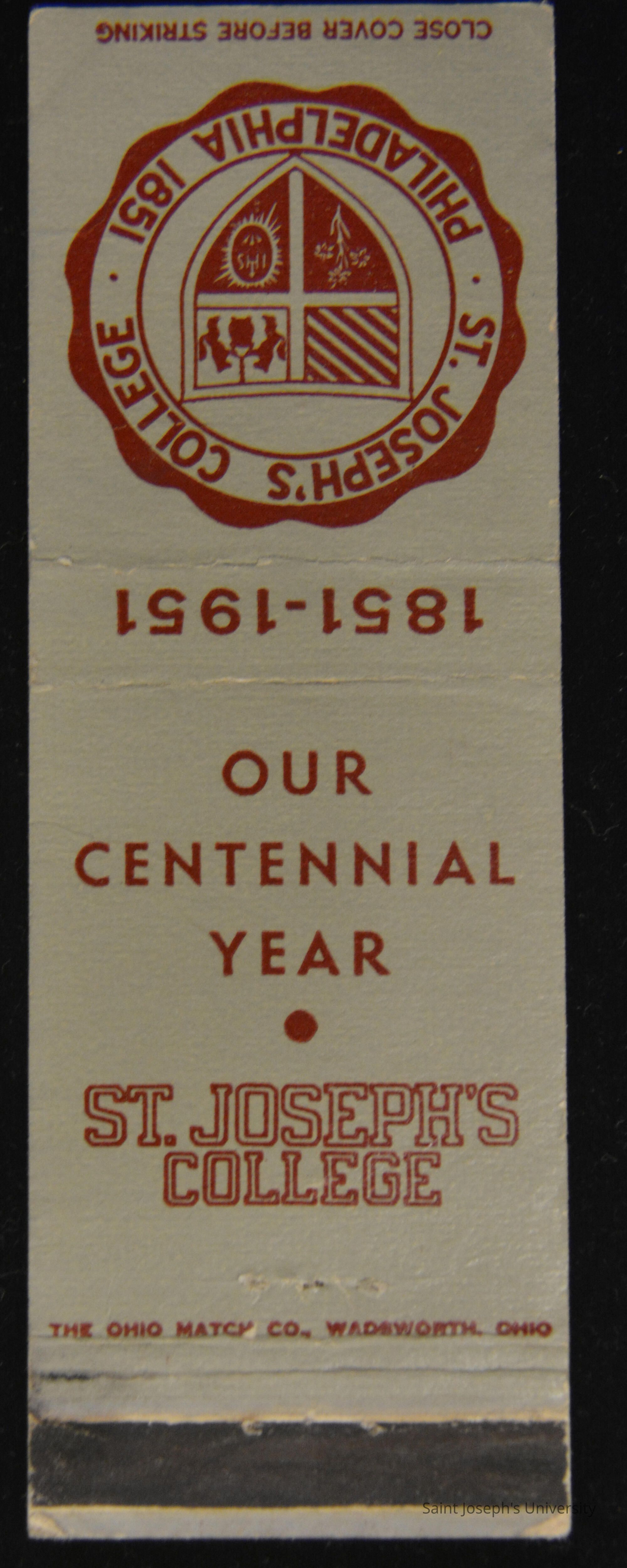 A gray colored matchbook with red detailing "1851-1951 CLOSE COVER BEFORE STRIKING" with the SJC seal. The reverse side includes "OUR CENTENNIAL YEAR ST. JOSEPH'S COLLEGE THE OHIO MATCH CO., WADSWORTH, OHIO."Made/Created