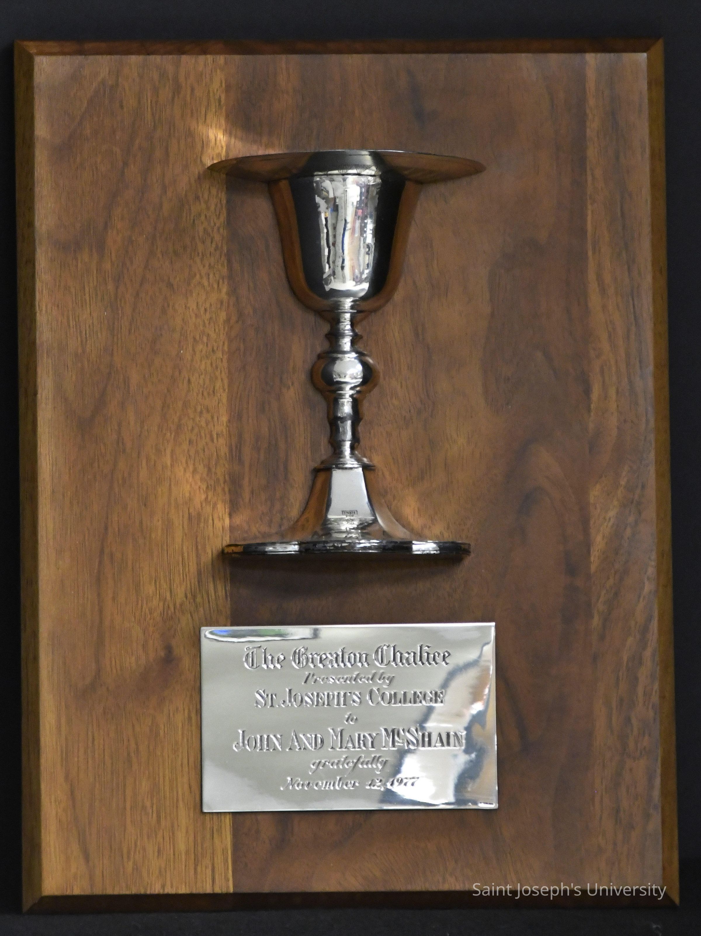 Greaton Chalice with wood backing, silver chalice and plaque. The plaque notes "THE GREATON CHALICE PRESENTED BY ST. JOSEPH'S COLLEGE TO JOHN AND MARY McSHAIN GRATEFULLY NOVEMBER 12, 1977." The bottom of the lip of the chalice contains a sun design and the base contains the image of Christ.Made/Created