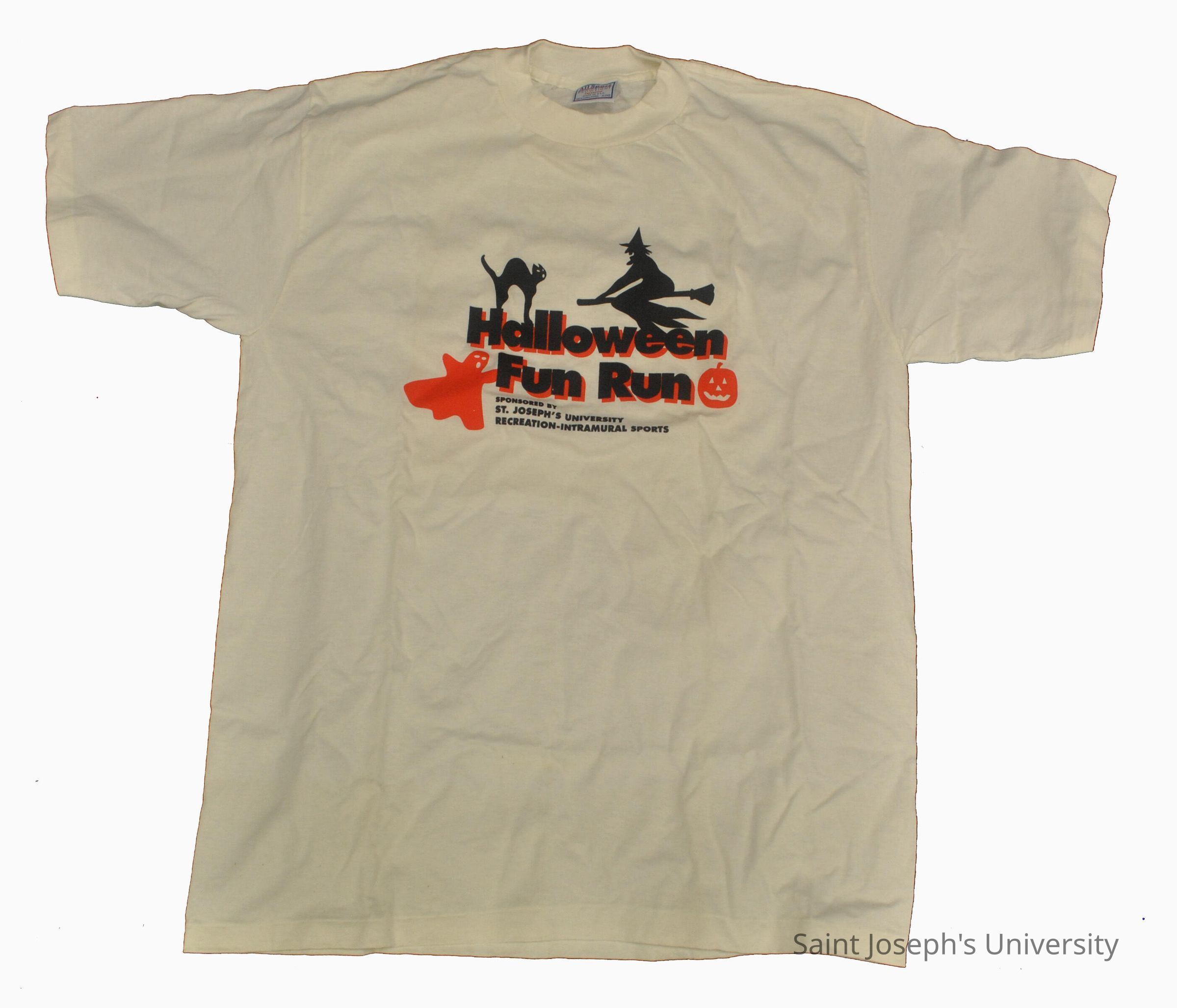 White T-shirt with the following text "HALLOWEEN FUN RUN SPONSORED BY SAINT JOSEPH'S UNIVERSITY RECREATION-INTRAMURAL SPORTS." The text is black with an orange shadow. An orange colored ghost and pumpkin are on the left and right side of the text and a black colored cat and witch set atop of the text.