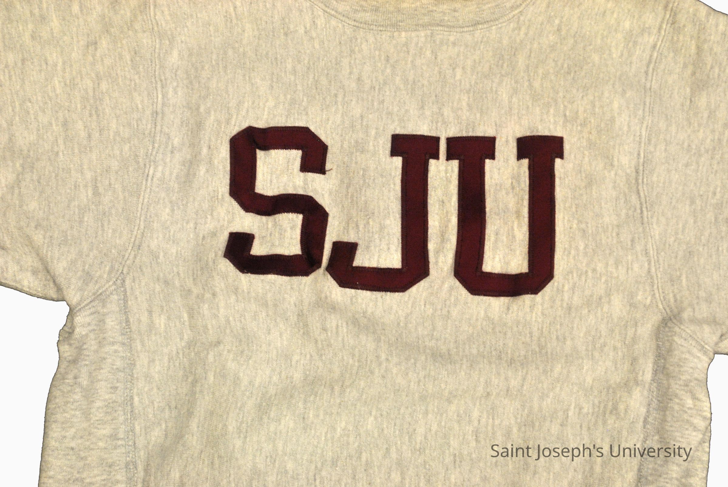 A gray colored reverse weave warmup sweatshirt with maroon SJU letters sewn on front.