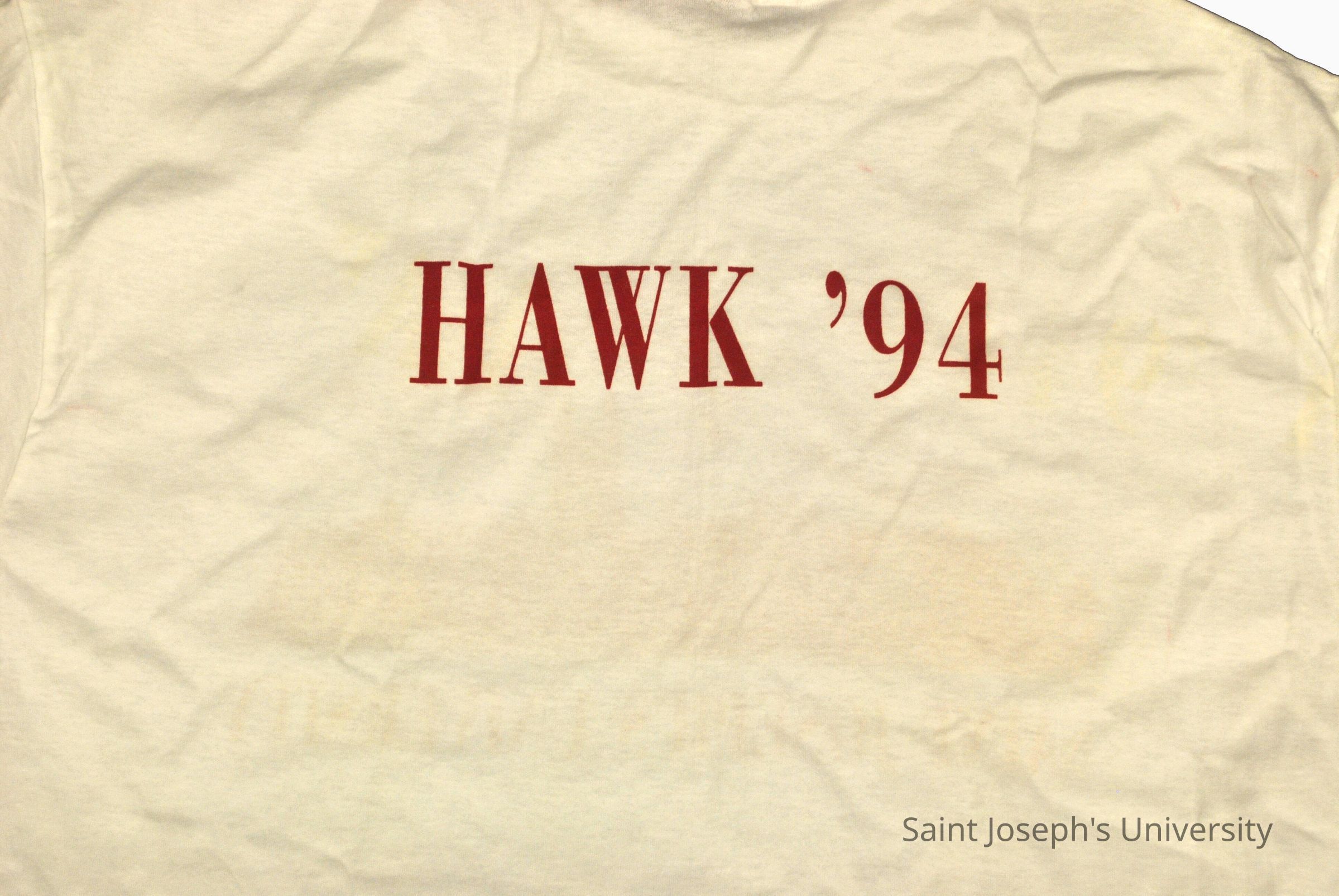 White T-shirt with red ink. The front includes an image of the SJU campus (including Barbelin) and the words "SAINT JOSEPH'S UNIVERSITY." The reverse side includes "HAWK '94."