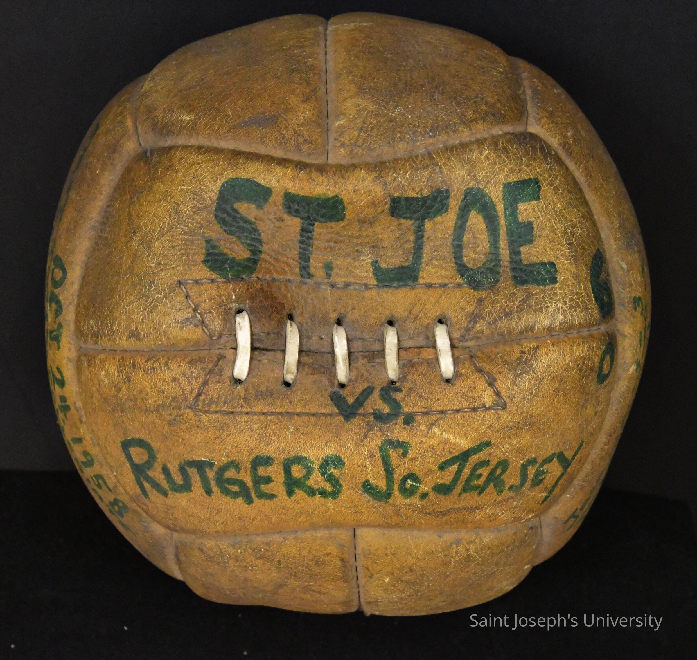 Soccer ball labeled with blue Sharpie pen noting the ball was used in the first intercollegiate soccer match of the school's history on October 24,1958. Played on Finnesey (now Sweeney) Field, the SJC Hawks defeated Rutgers-Camden 6-0. Jack Walls and Jay Crawford each scored 3 goals. The 1958 season scored 4 wins and 2 loses.Made/Created