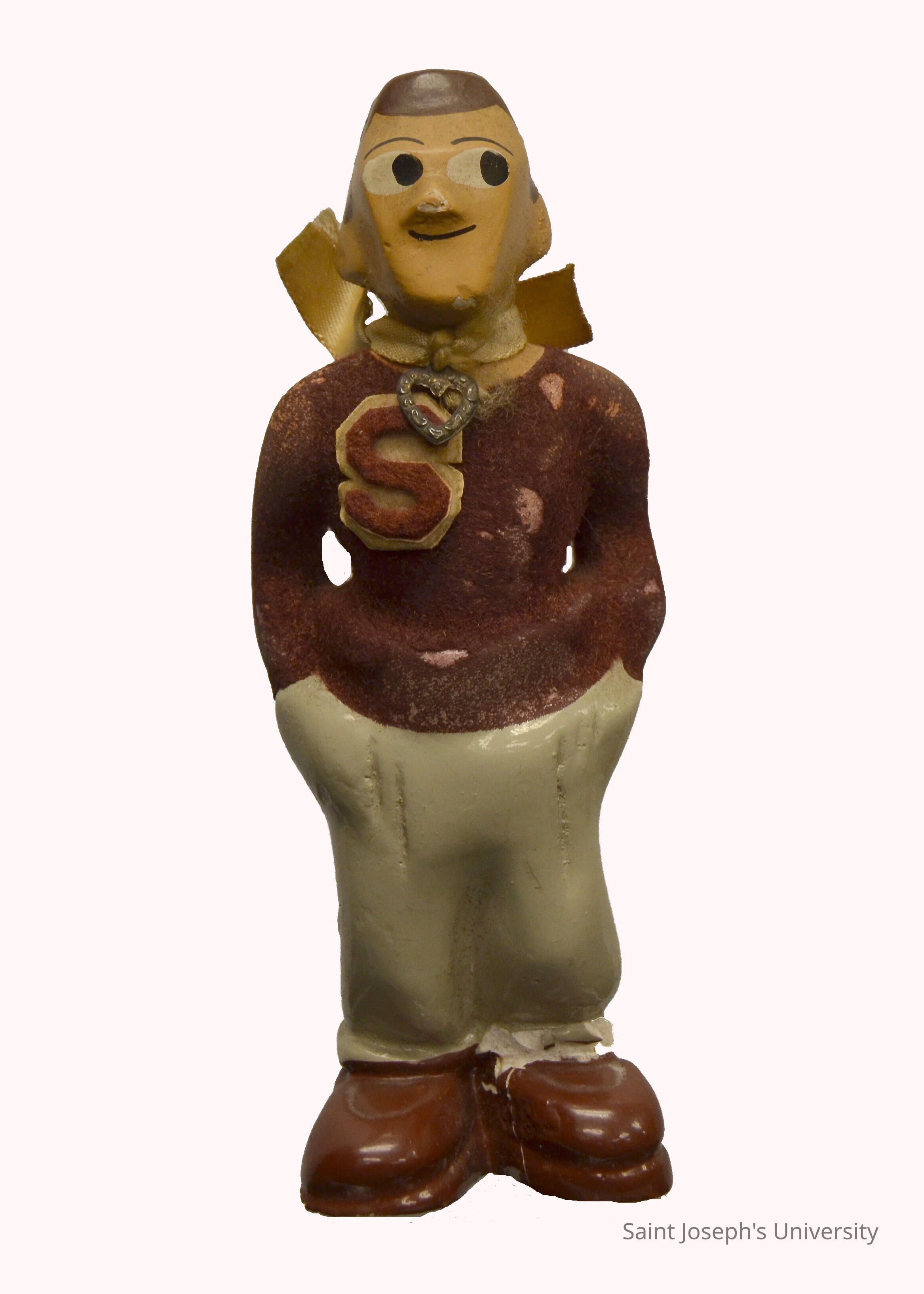 Figurine of a SJC student in maroon felt sweater, and painted maroon shoes, and gray pants. A gray ribbon holds the letter "S" with a heart shaped attachment.