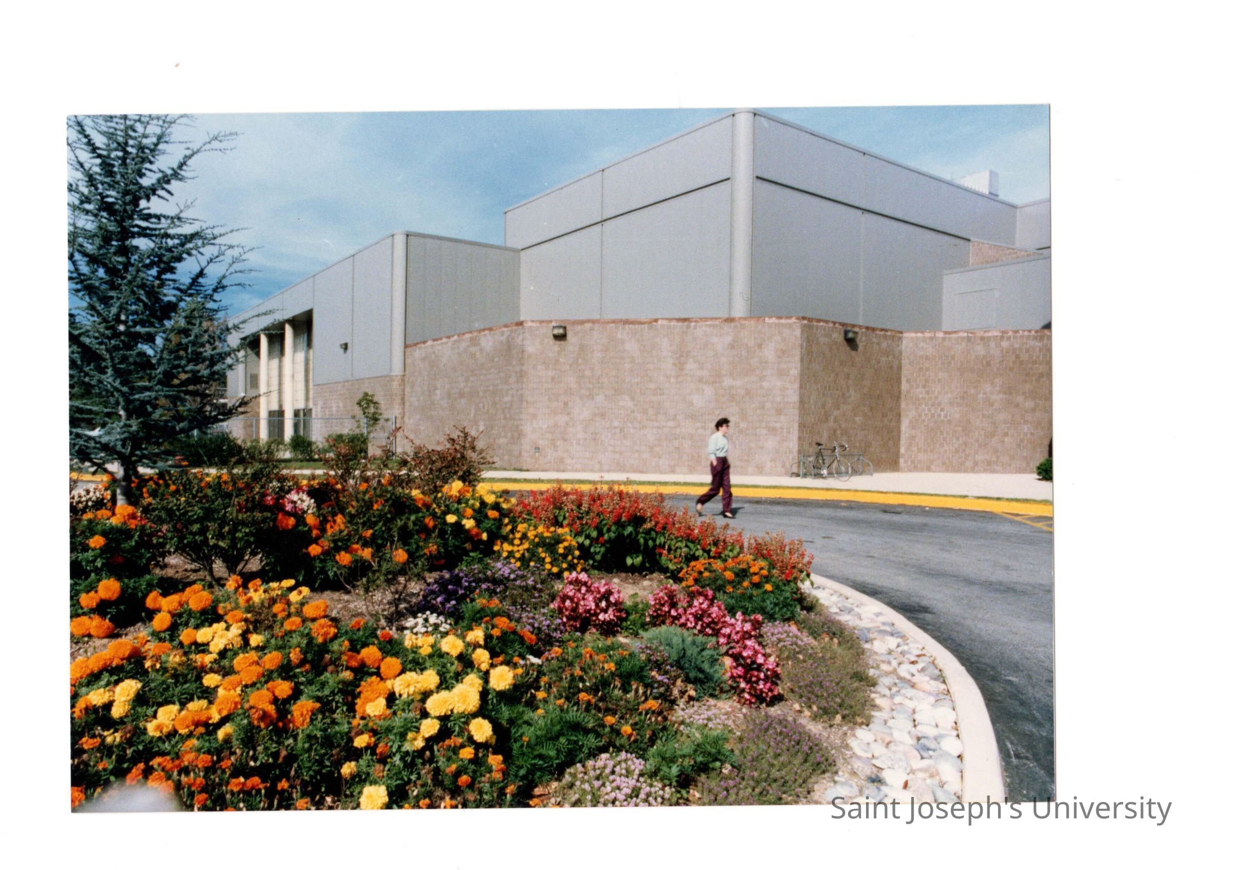 Exterior view of Sports Complex with drive around circle planted in chrysanthemums.