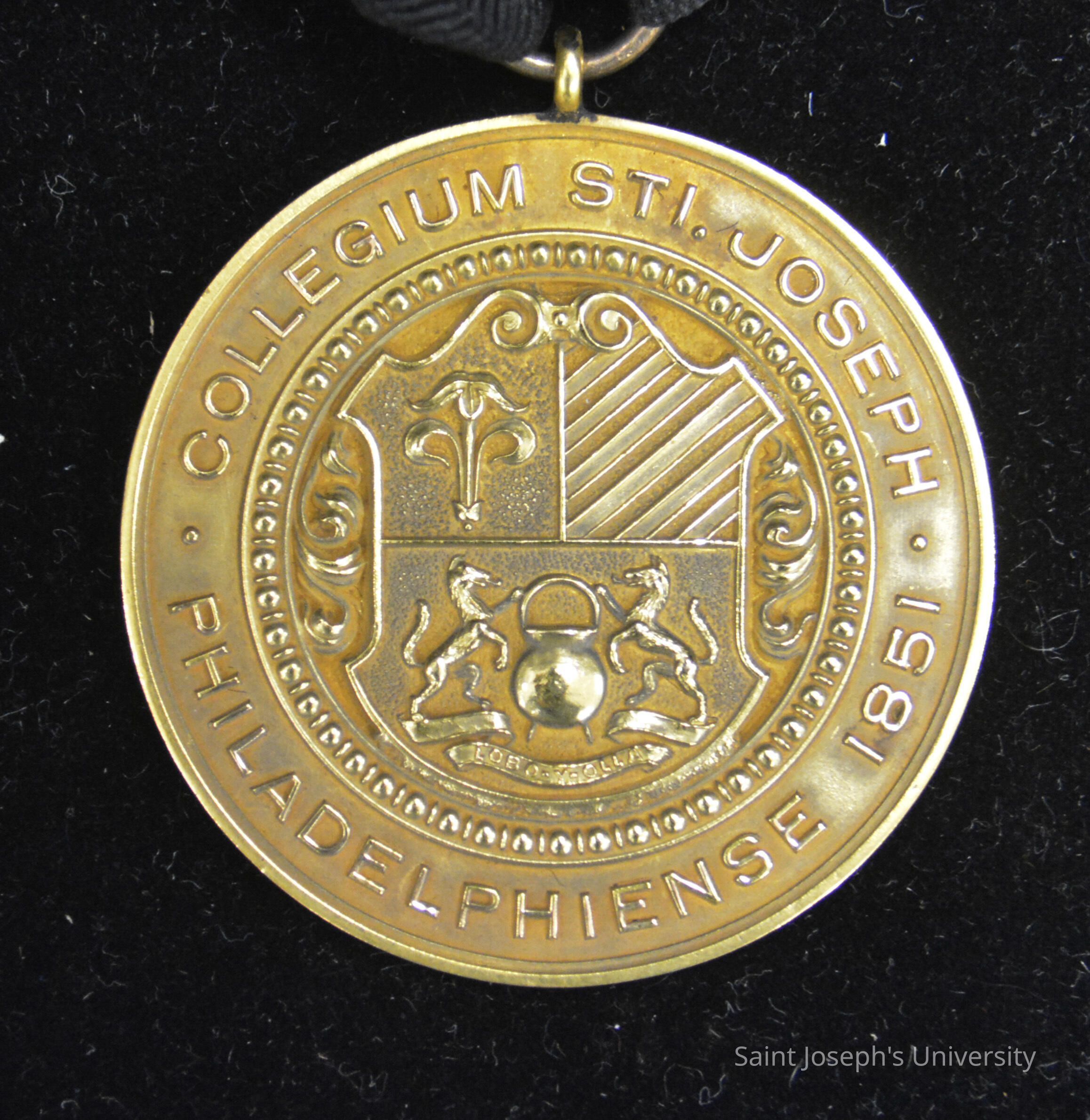 Gold (10K) medal with an early depiction of the SJC seal without the IHS monogram. The back contains "EXCELLENCE IN DEBATE JAMES E. GALLAGHER, JR. '29" with maker's mark. Attached black ribbon and hook.