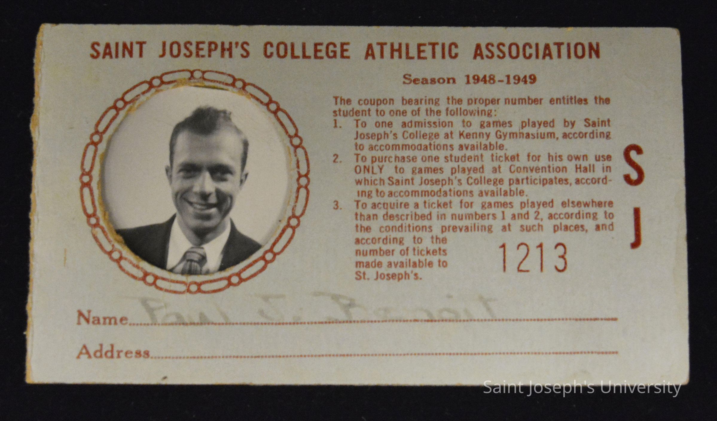 SJC Athletic Association student admission ticket. Composed of light blue cardboard with red ink and a circular opening that includes a black and white photograph of the student. The ticket notes "SAINT JOSEPH'S COLLEGE ATHLETIC ASSOCIATION/ SEASON 1948-1949/ THE COUPON BEARING THE PROPER NUMBER ENTITLES THE STUDENT TO ONE OF THE/ FOLLOWING:/