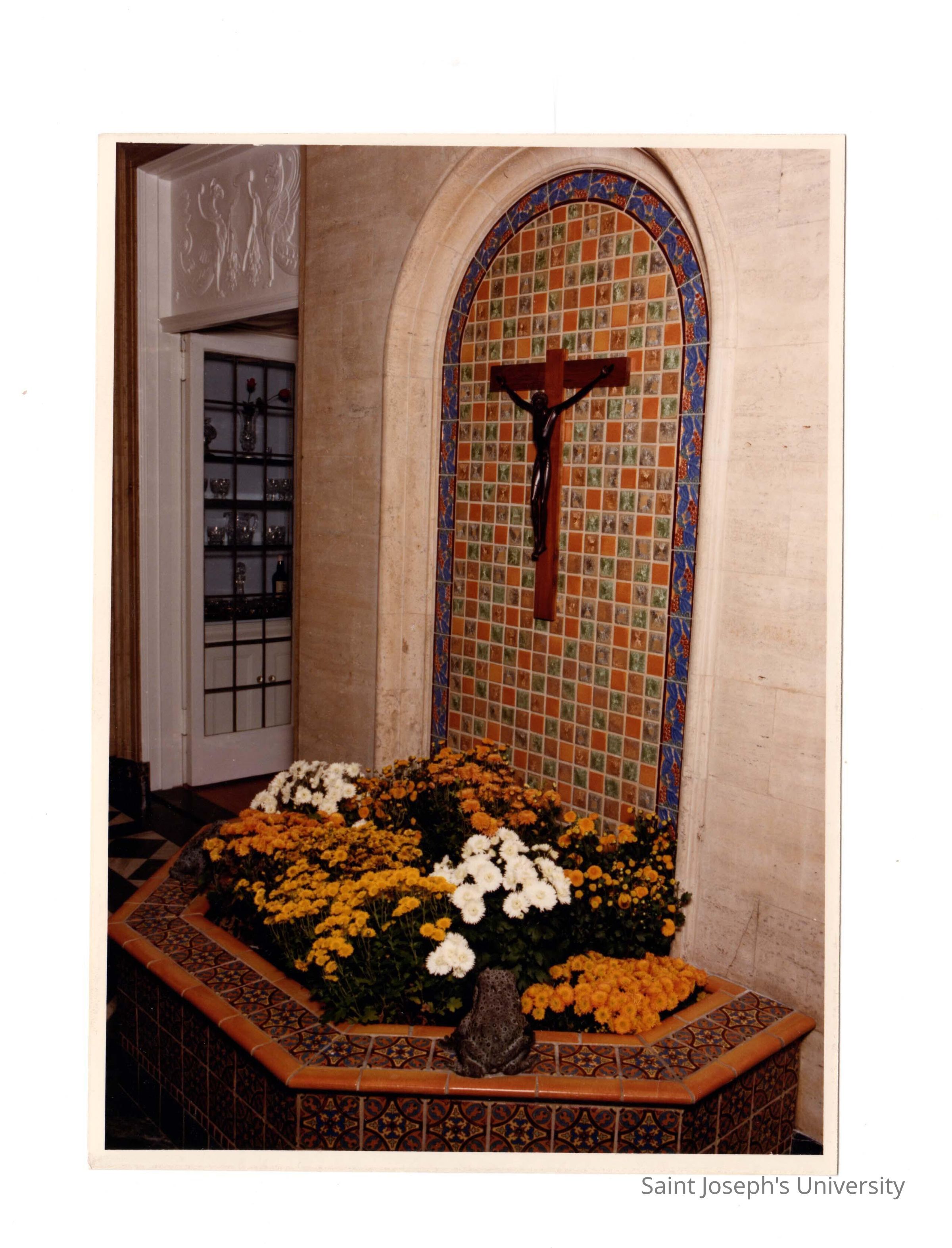 View of tiled fountain and chrysanthemums in sun porch in Regis Hall.