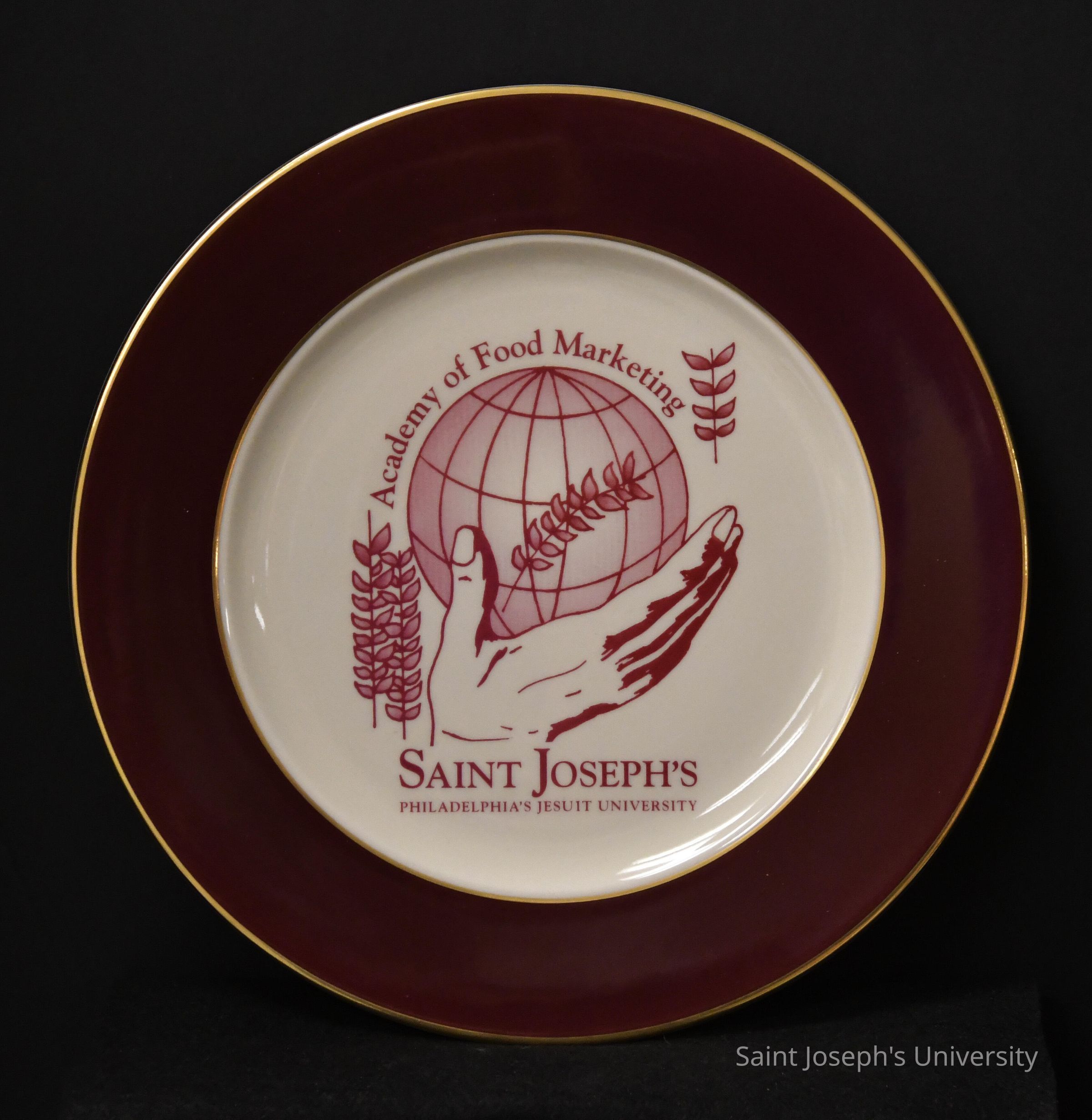 Two identical commemorative plates. The round plates consist of crimson border with gold detailing with the Academy of Food Marketing emblem with "SAINT JOSEPH'S PHILADELPHIA'S JESUIT UNIVERSITY."