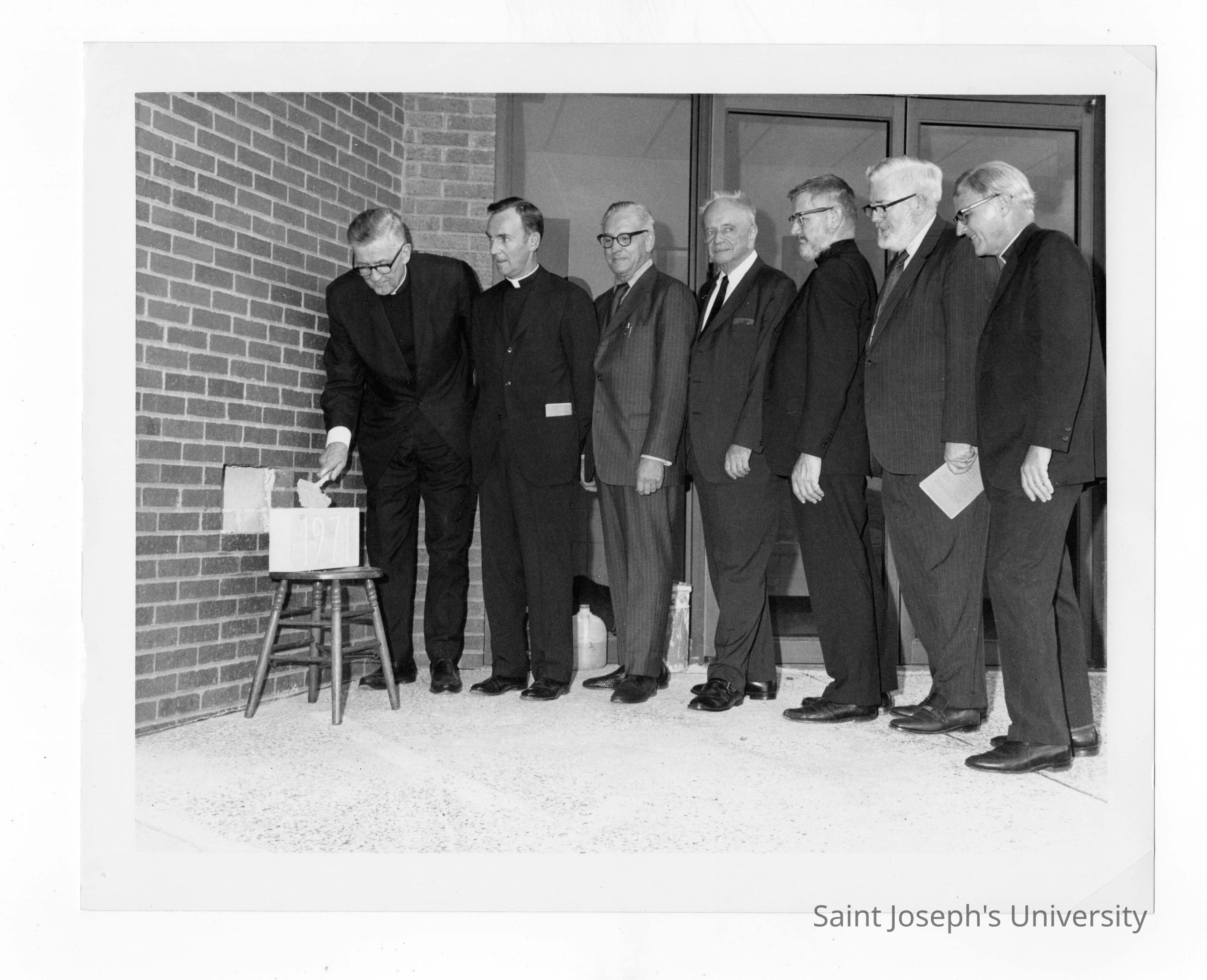 Laying of cornerstone of science center with William F. Maloney, S.J., Terrence Toland, S.J., Dr. James E. Dougherty, and others.