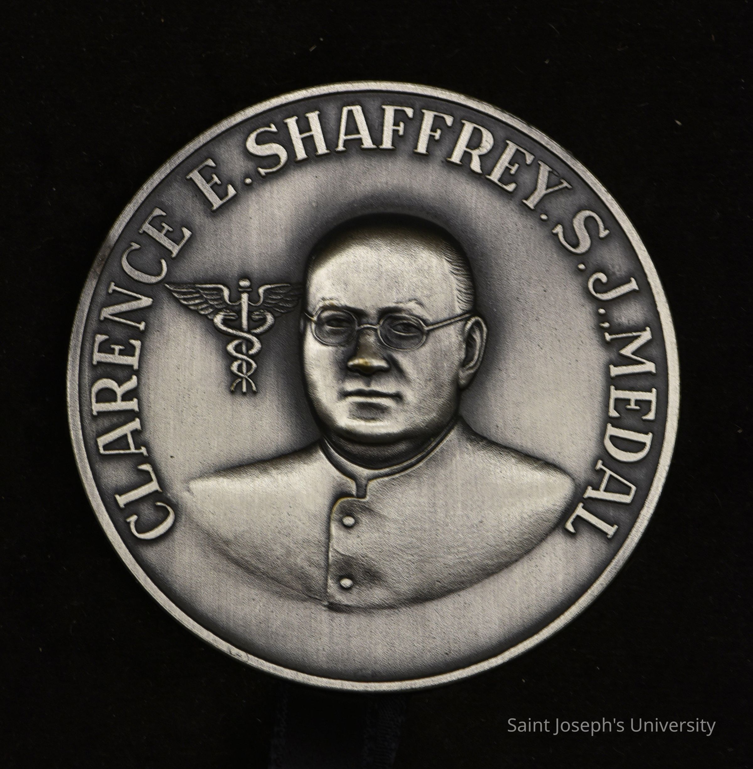 Clarence Shaffrey, S.J. Award sample. Round silver medal with an image of Charles E. Shaffrey, S.J. with his name surrounding him and the medical emblem. The back includes "THE MEDICAL ALUMNI OF SAINT JOSEPH'S UNIVERSITY REPRESENTS THIS AWARD TO __ FOR DISTINGUISHED CONTRIBUTION TO MEDICAL SCIENCE" with the school seal and decorative ivy.