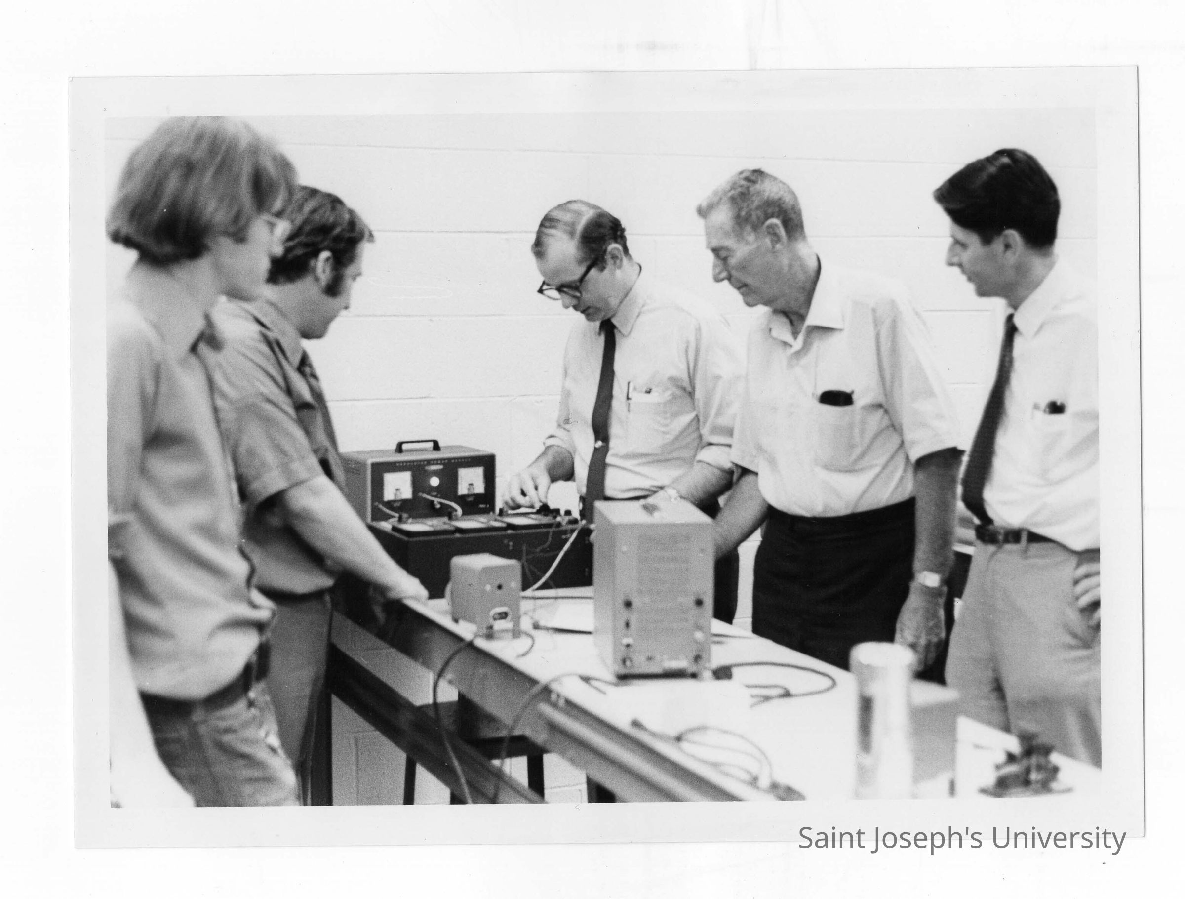 Howard J. Heim, S.J., professors and students working in science laboratory.